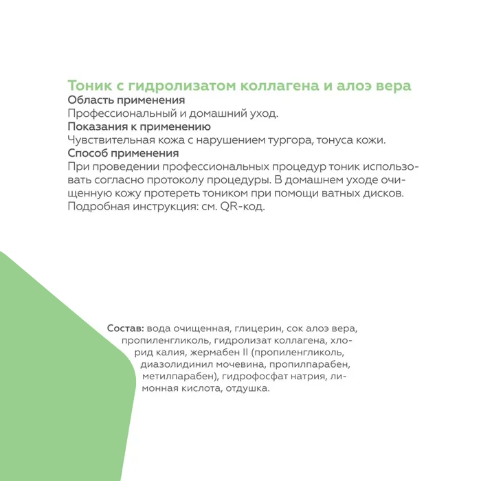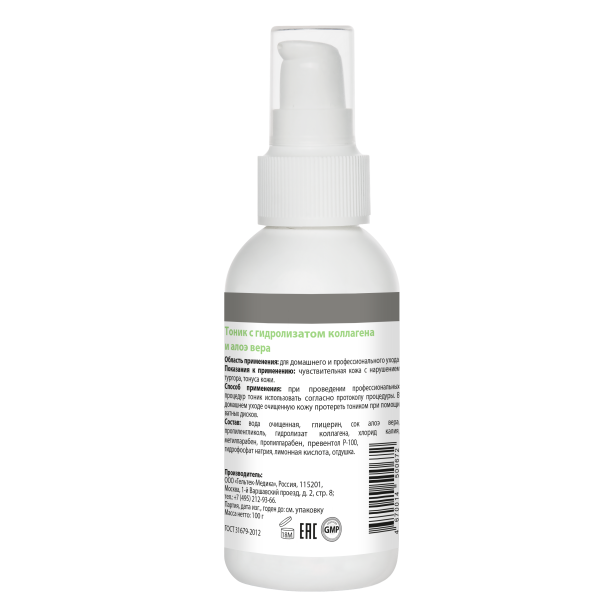 Тоник с гидролизатом коллагена и алоэ вера восстанавливает упругость и эластичность кожи. Сок лекарственного растения Aloe Vera оказывает противовоспалительное действие, устраняет раздражение, шелушение, сухость кожи.