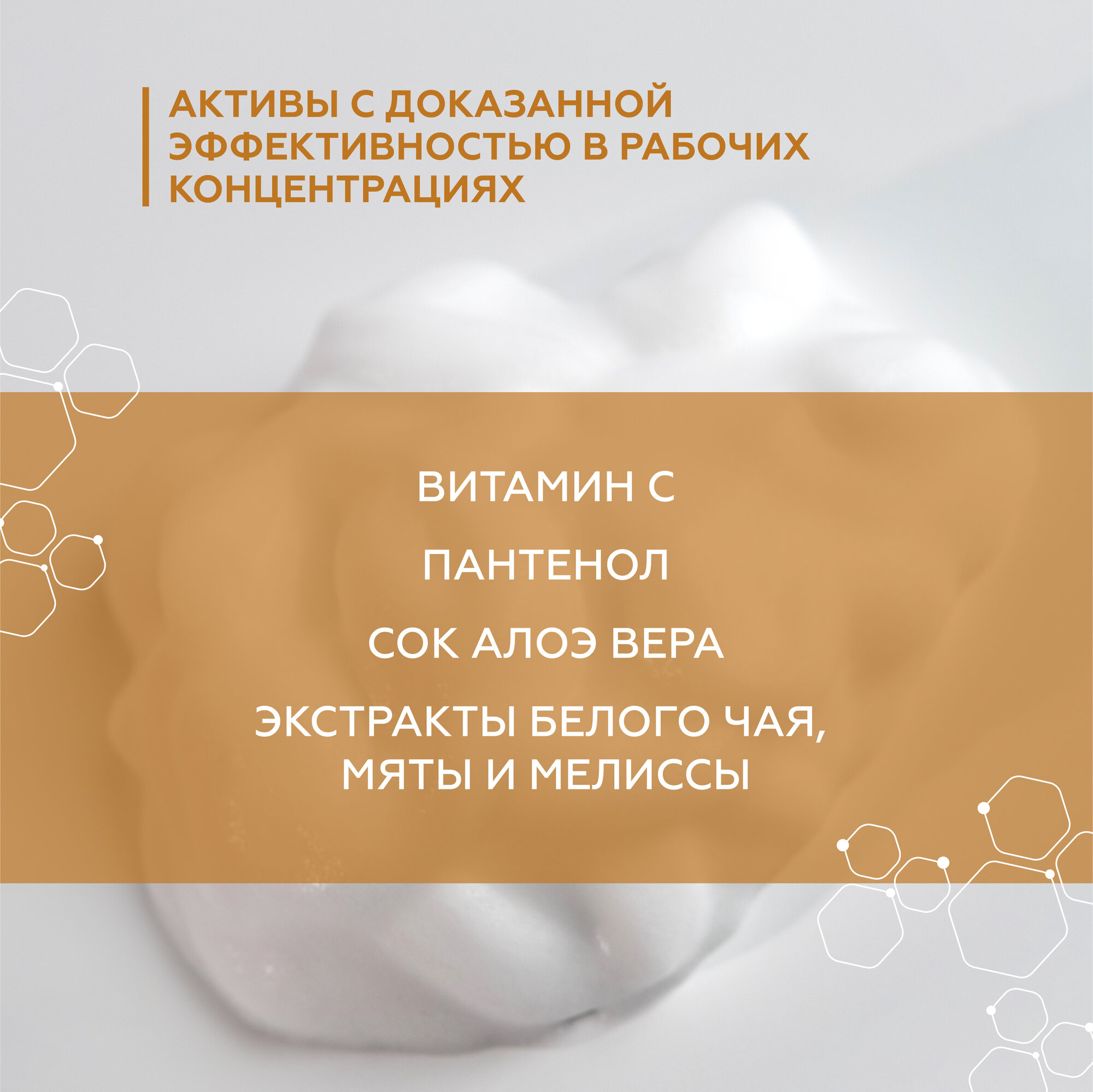 Воздушный мусс для умывания на основе мягких неионогенных поверхностно-активных веществ, которые сохраняют защитный барьер кожи и не пересушивают ее. Благодаря витамину С, мусс придает коже сияние и выравнивает тон. Д-пантенол и сок алоэ-вера в составе мусса оказывают успокаивающее и иммуностимулирующее действие на эпидермис, а также предотвращают чувство дискомфорта и стянутости после контакта с водой. Средство экономично и удобно в использовании, не щиплет глаза, не раздражает кожу и может применяться для снятия косметики и загрязнений с области глаз.