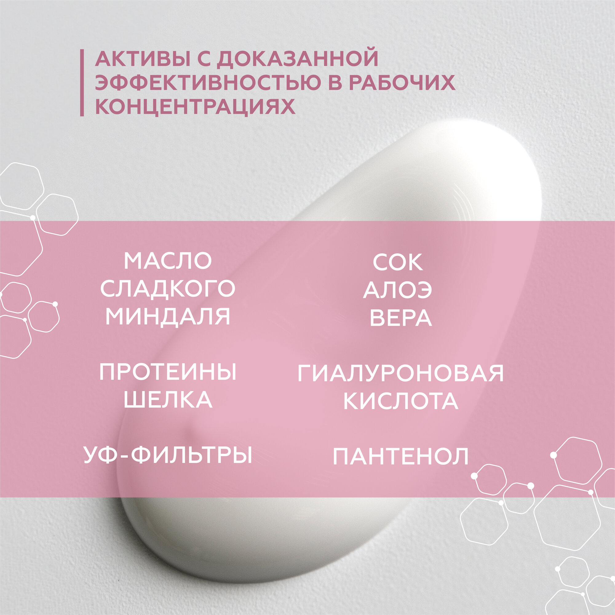 | Состав | Вода очищенная, изононилизононаноат, глицерин, цетеарилоливат, сорбитаноливат, масло сладкого миндаля, авобензон, октокрилен, пропиленгликоль, гидролизованные протеины шелка, гиалуроновая кислота, Д-пантенол, сок алоэ вера, масло ши, глицерилстеарат СЕ, аристофлекс, жермабенII, тиногардТТ, отдушка, бутилфенилметилпропиональ, линалоол, гексилциннамаль |