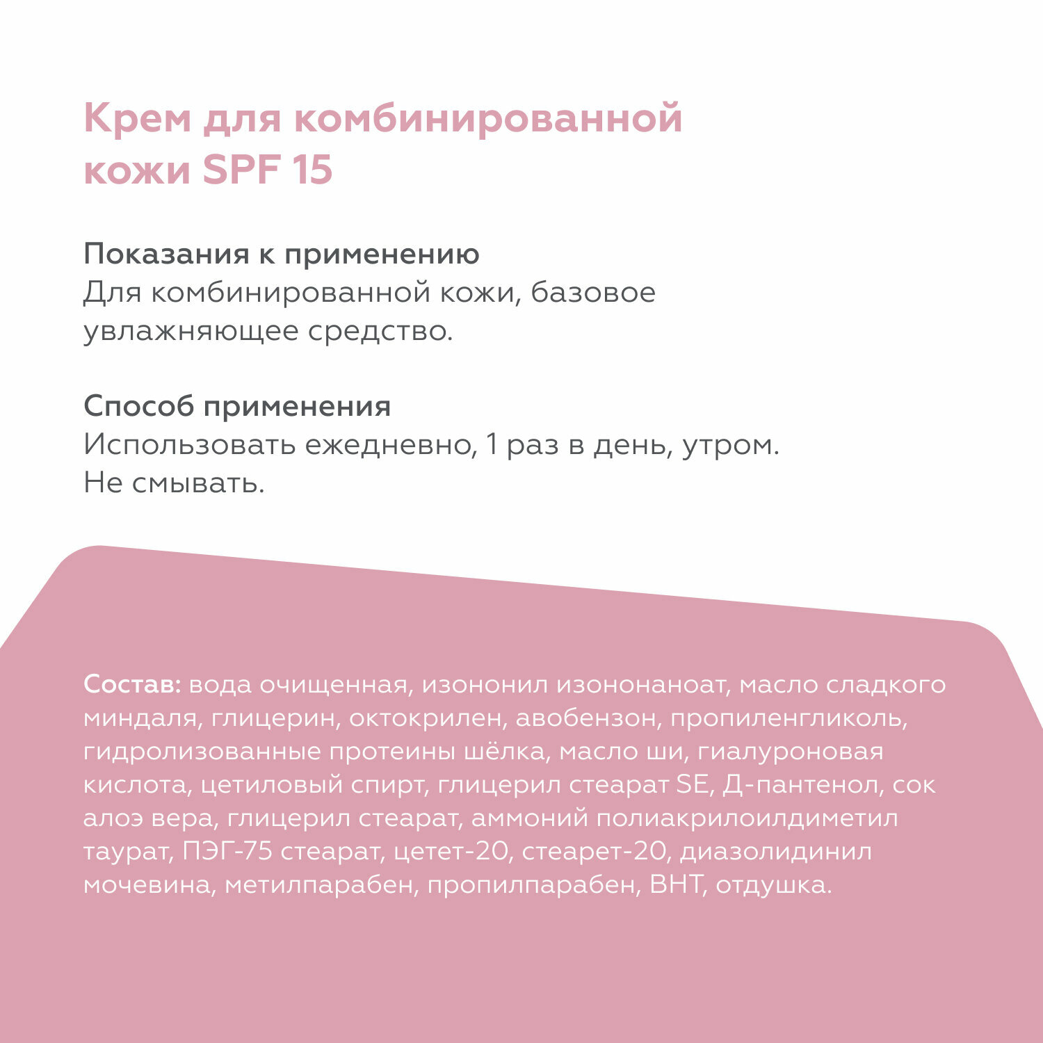 Крем для комбинированной кожи увлажняет кожу без утяжеления, а также защищает ее от УФ-излучения и других негативных факторов окружающей среды. Основа крема - масло сладкого миндаля и протеины шелка, которые делают кожу мягкой, гладкой и бархатистой. Также в состав включены такие необходимые ингредиенты для эффективного увлажнения и питания кожи, как высокомолекулярная гиалуроновая кислота, масло ши, сок Aloe Vera. Д-пантенол восстанавливает и предотвращает повреждения кожи, а уникальные УФ-фильтры последнего поколения, защищают от UVA и UVB лучей. Подходит для жирной и комбинированной кожи в качестве базового дневного увлажняющего средства, основы под макияж, идеальный вариант для завершения салонных процедур.