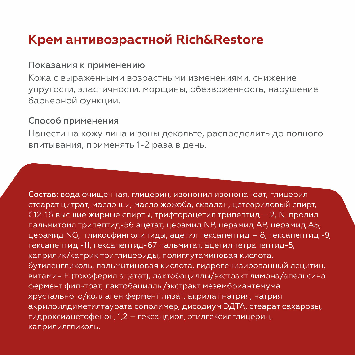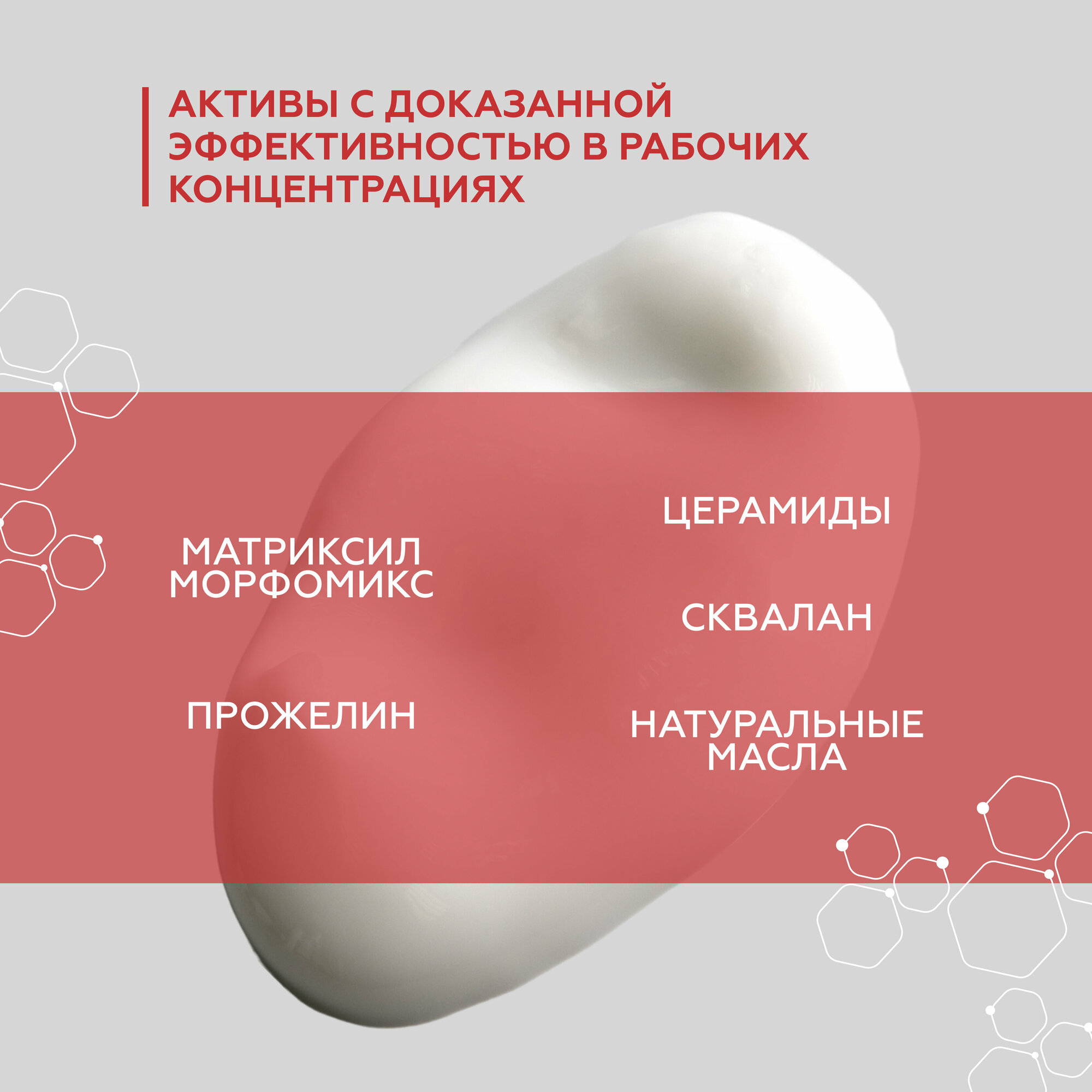 Нежный крем с бархатистой текстурой обеспечивает интенсивный уход за сухой и нормальной кожей, в том числе с повышенной чувствительностью, с возрастными изменениями (мелкими морщинами, снижением эластичности, обезвоженностью, нарушением барьерной функции). За счёт активного состава крем обладает комплексным действием, работая сразу в нескольких направлениях для решения конкретных задач антивозрастного ухода за кожей. Два пептидных комплекса (матриксил морфомикс и прожелин) обеспечивают направленное действие на борьбу с возрастными изменениями: улучшают тургор, повышают упругость и эластичность, уменьшают выраженность и количество морщин, обеспечивают выраженный лифтинг-эффект и моделируют контуры лица. Натуральные масла ши и жожоба эффективно питают и устраняют шелушения, насыщая кожу антиоксидантами. Сквалан повышает уровень увлажненности, заполняет имеющиеся морщины и заломы, выравнивая тон и текстуру кожи. Церамиды снижают чувствительность и способствуют восстановлению здоровой гидролипидной мантии эпидермиса. Подходит для профессионального и домашнего ухода. Не содержит отдушек. Может применяться в качестве самостоятельного средства или совместно с активными сыворотками. Оптимальная длительность курса от 3-х месяцев, возможно постоянное применение по потребностям кожи.