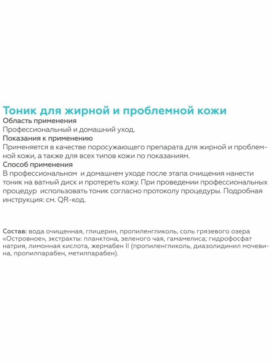 Тоник для жирной и проблемной кожи показан для ухода за кожей с повышенной сальностью. Он сужает поры, нормализует цвет и эластичность кожи, минимизирует воспалительные процессы. Идеально подходит для использования в качестве поросуживающего средства после всех видов чистки лица. Соли озера «Островное» содержат большое количество минералов, микроэлементов и биологически активных компонентов, обеспечивают высокую электропроводность геля и усиливают лимфодренаж.