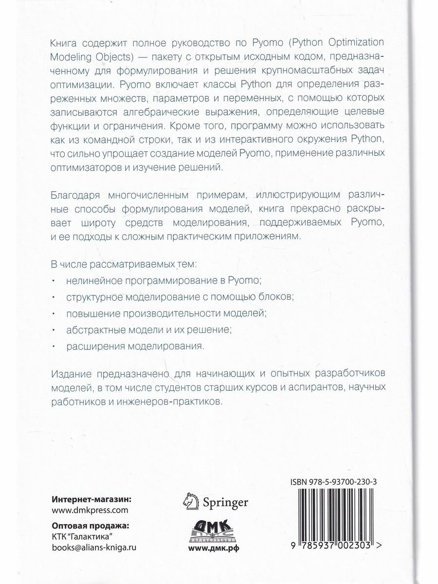 Книга содержит полное руководство по Pyomo (Python Optimization Modeling Objects) - пакету с открытым исходным кодом, предназначенному для формулирования и решения крупномасштабных задач оптимизации. Pyomo включает классы Python для определения разреженных множеств, параметров и переменных, с помощью которых записываются алгебраические выражения, определяющие целевые функции и ограничения. Кроме того, программу можно использовать как из командной строки, так и из интерактивного окружения Python, что сильно упрощает создание моделей Pyomo, применение различных оптимизаторов и изучение решений. Благодаря многочисленным примерам, иллюстрирующим различные способы формулирования моделей, книга прекрасно раскрывает широту средств моделирования, поддерживаемых Pyomo, и ее подходы к сложным практическим приложениям.