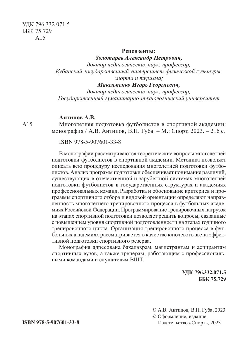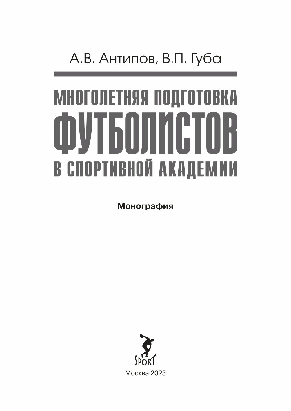 Многолетняя подготовка футболистов в спортивной академии. Монография (Губа Владимир Петрович,Антипов Александр Викторович); Спорт, 2023