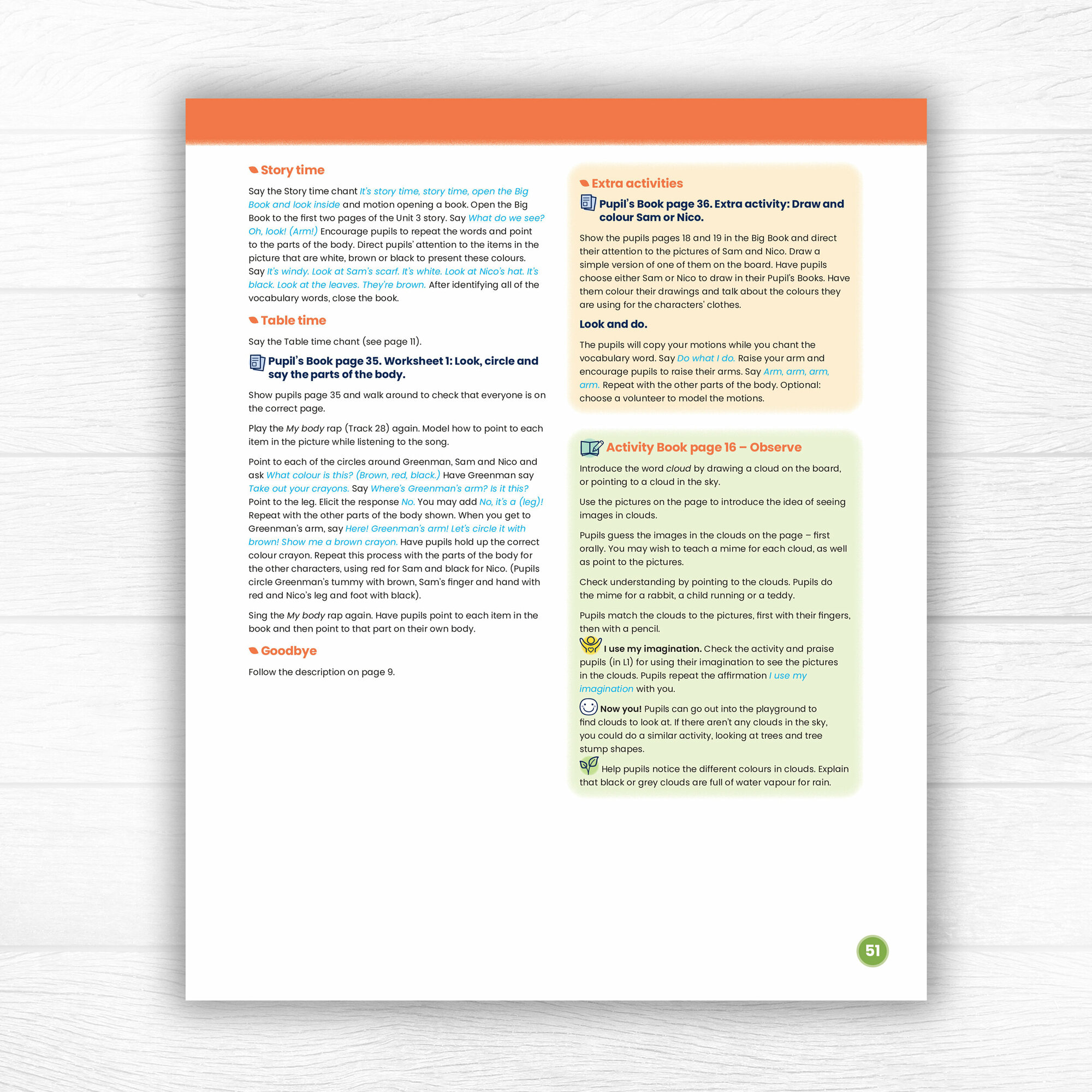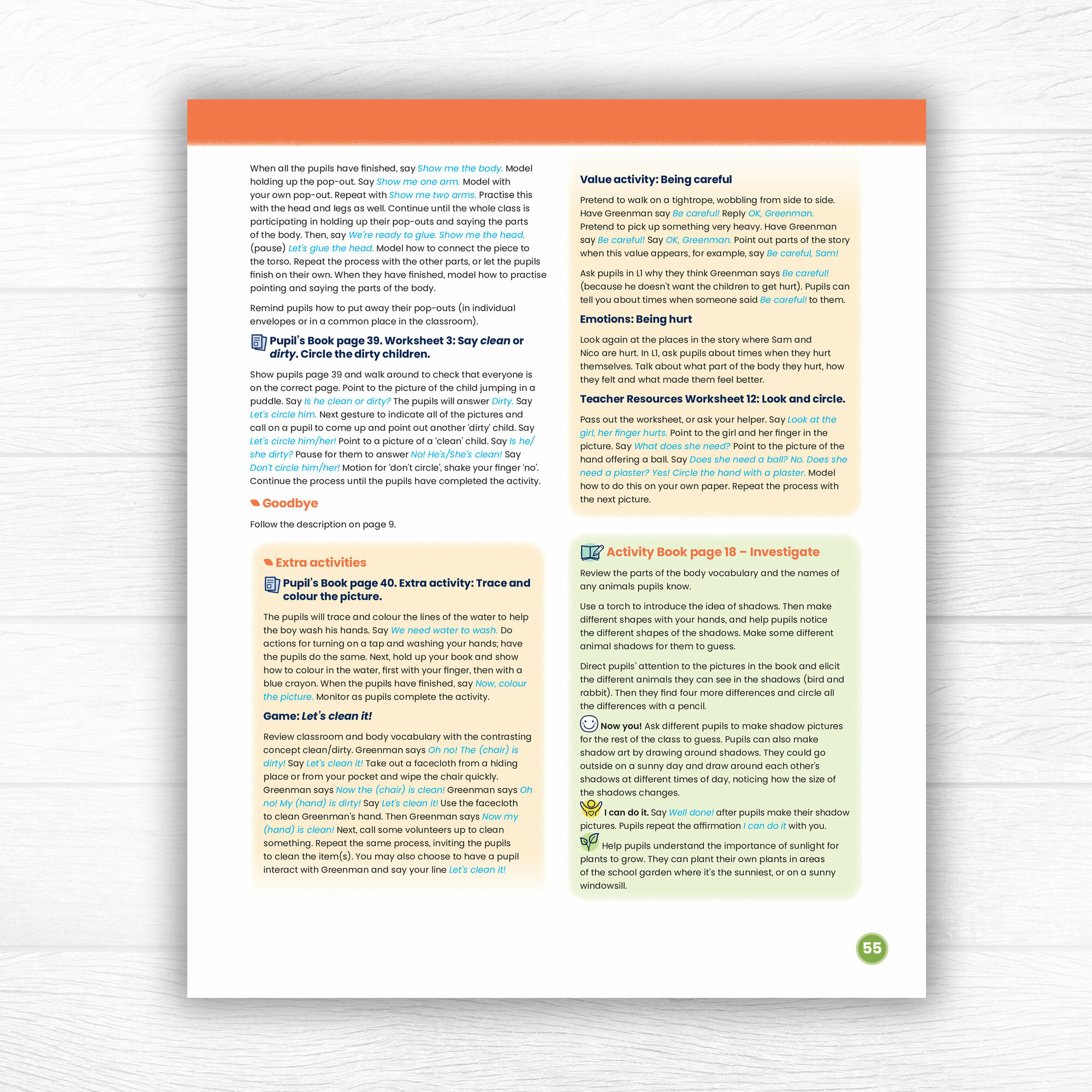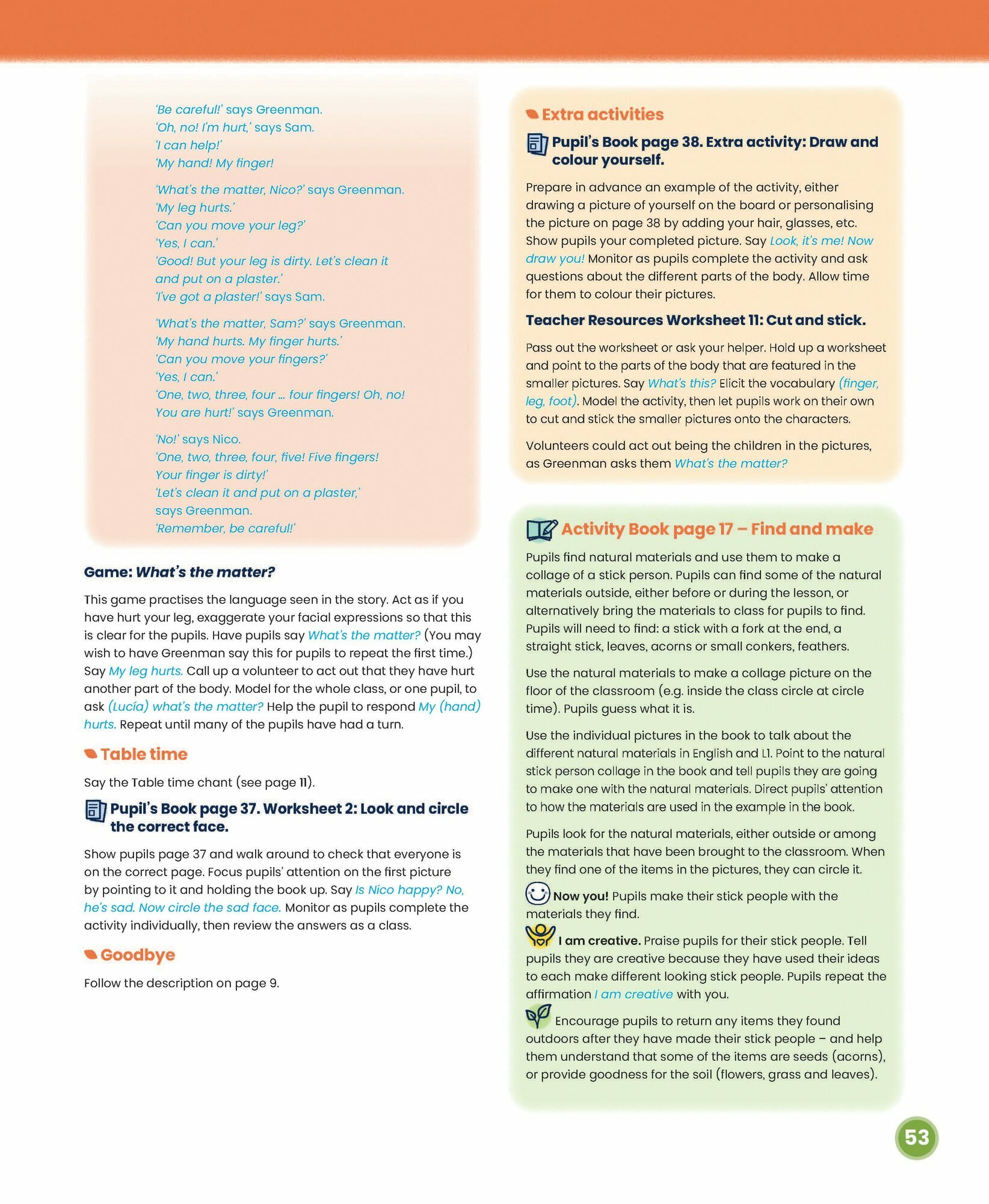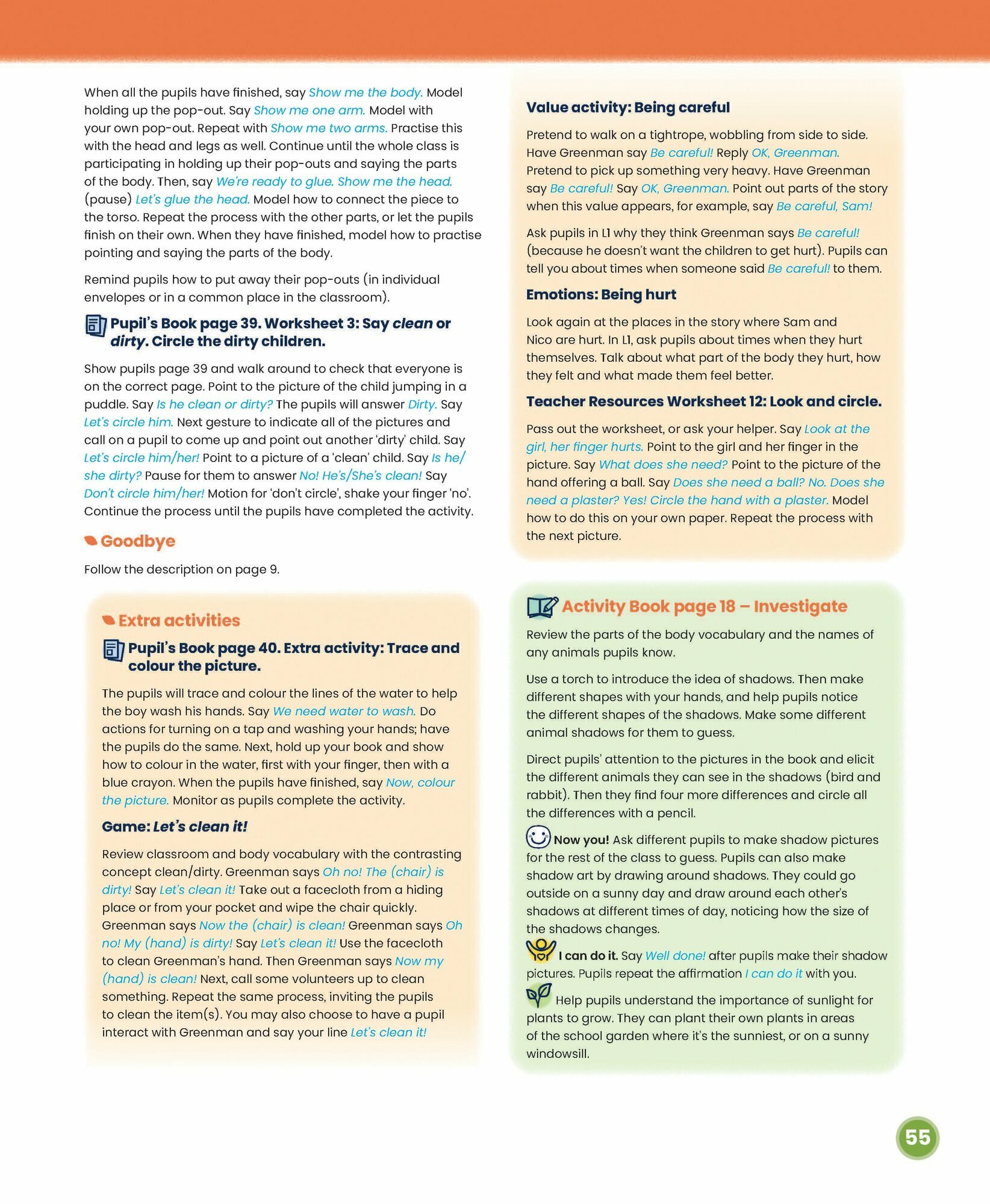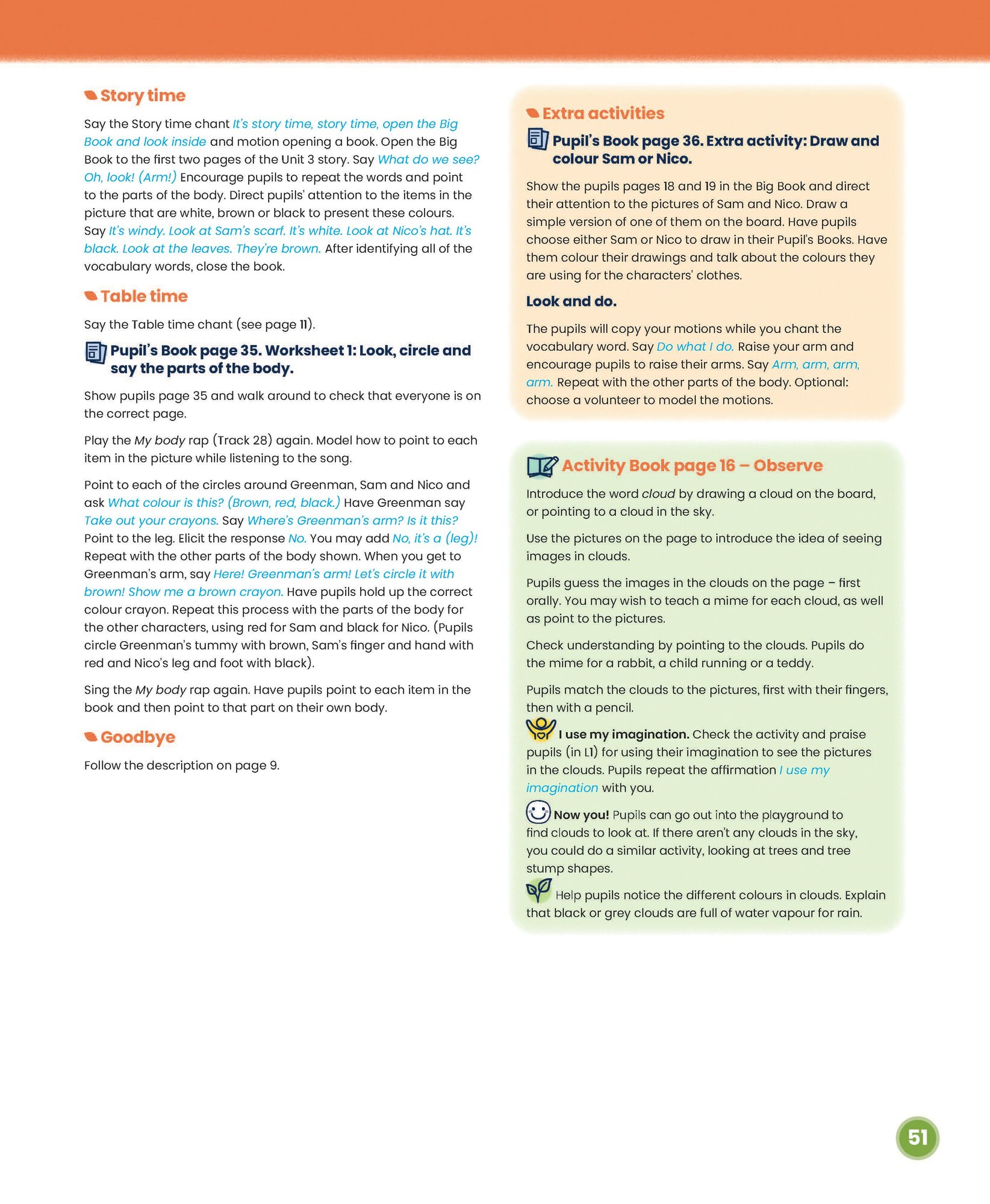 Книга для учителя содержит всю информацию, необходимую учителям для планирования и проведения уроков. К каждому уроку прилагается полное руководство, включая дополнительные задания и игры для продления занятий. Спиральный переплет делает книгу для учителя удобной в использовании при планировании и обучении.