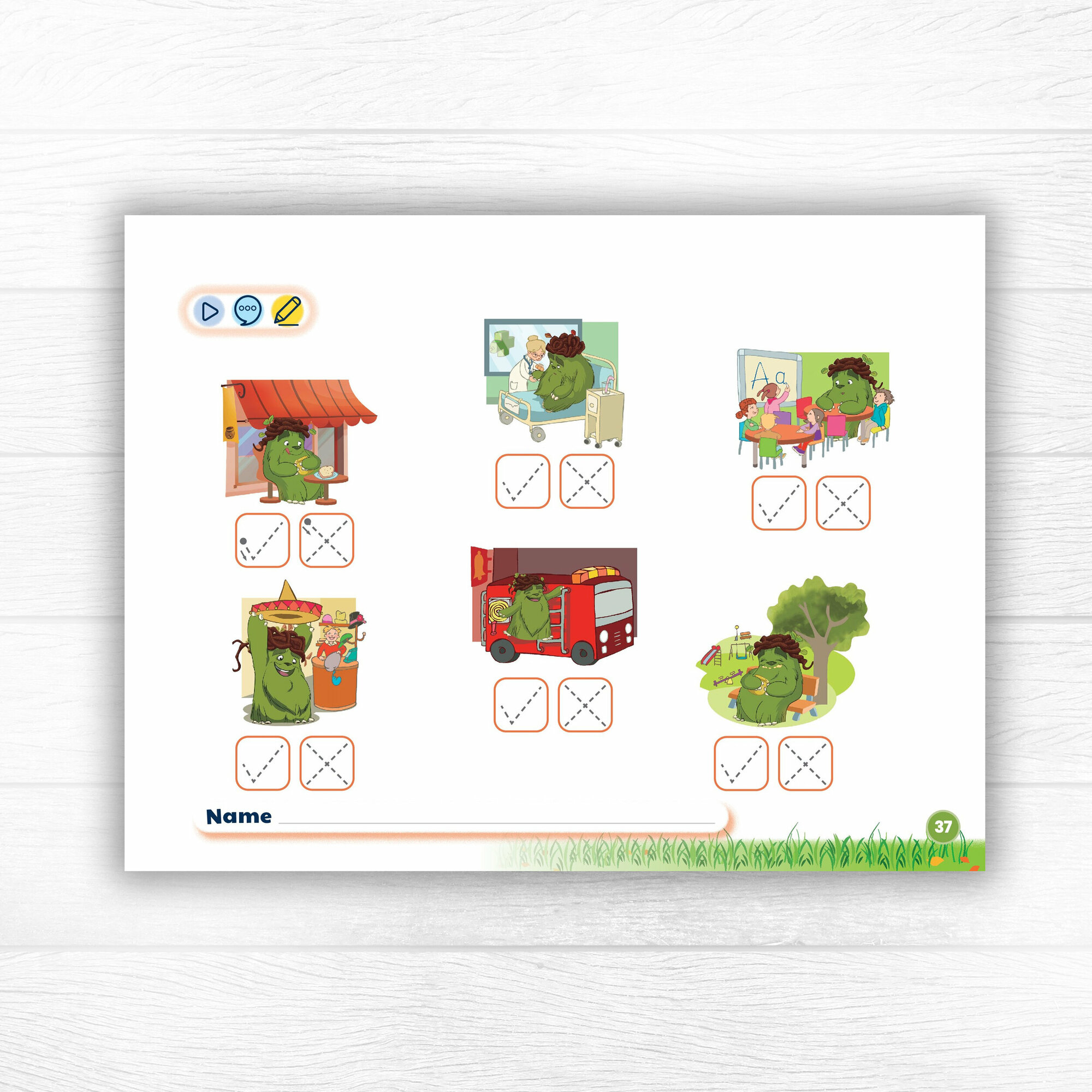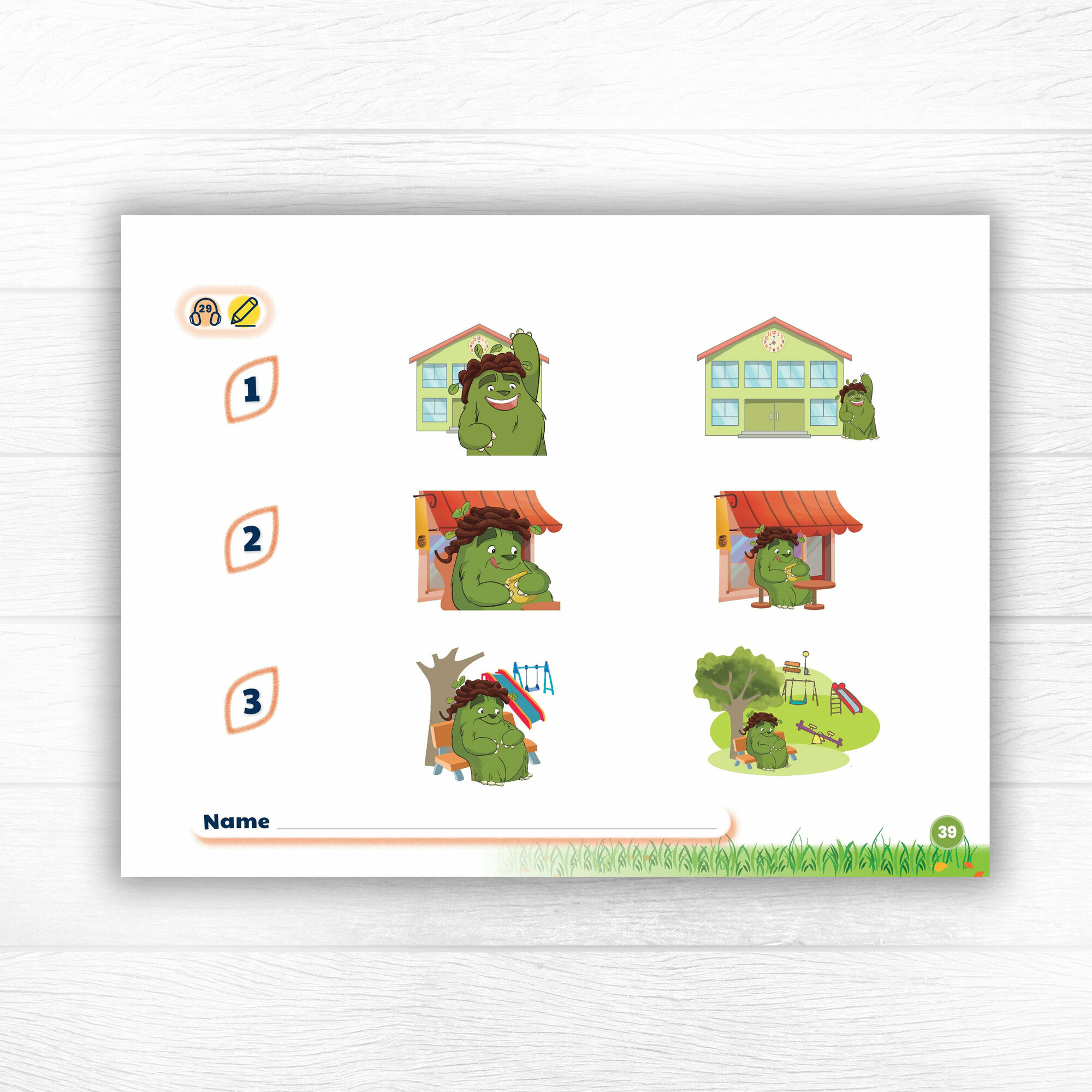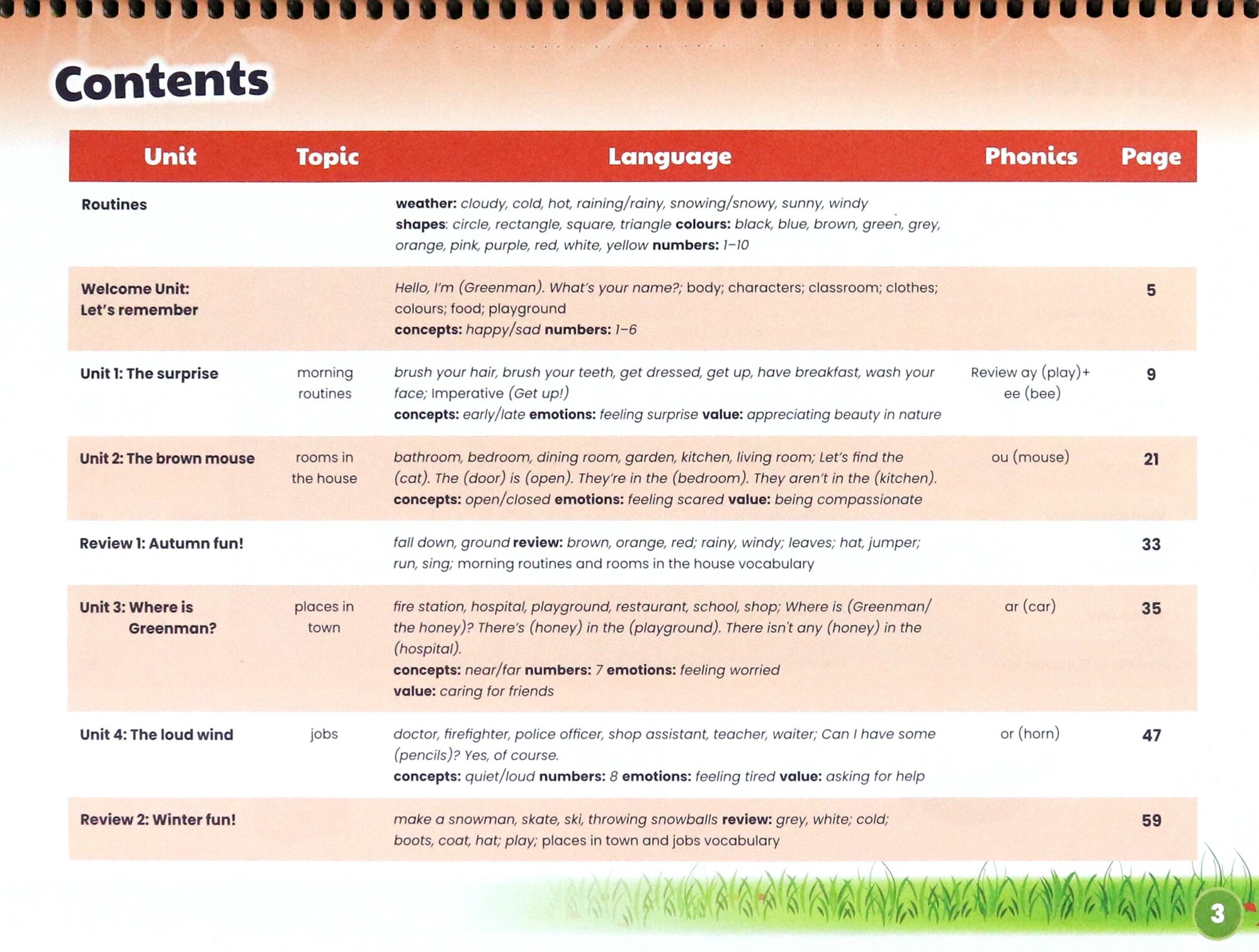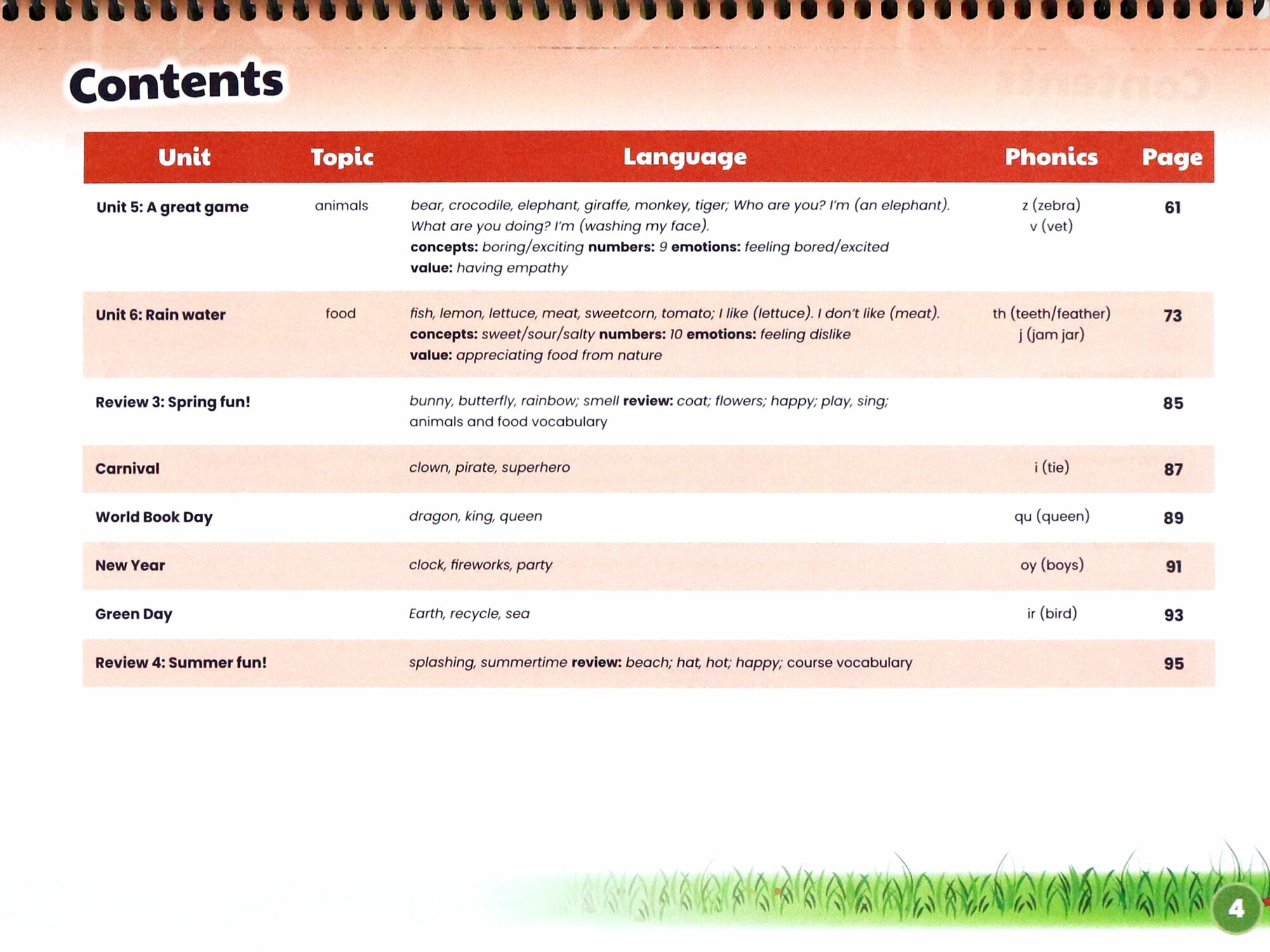 Учебник включает в себя наклейки и объемные элементы (прилагаются в отдельном конверте). Широкий формат и спиральный переплет удобны для маленьких детей, поскольку они учатся находить страницы с номерами страниц и работать с книгой. В книгу включены отрывные листы, так что у учителя есть возможность дать ученикам отдельные листы для ознакомления дома. На обратной стороне каждого рабочего листа приведены краткие заметки учителя с текстом песни и ключевым языком.
