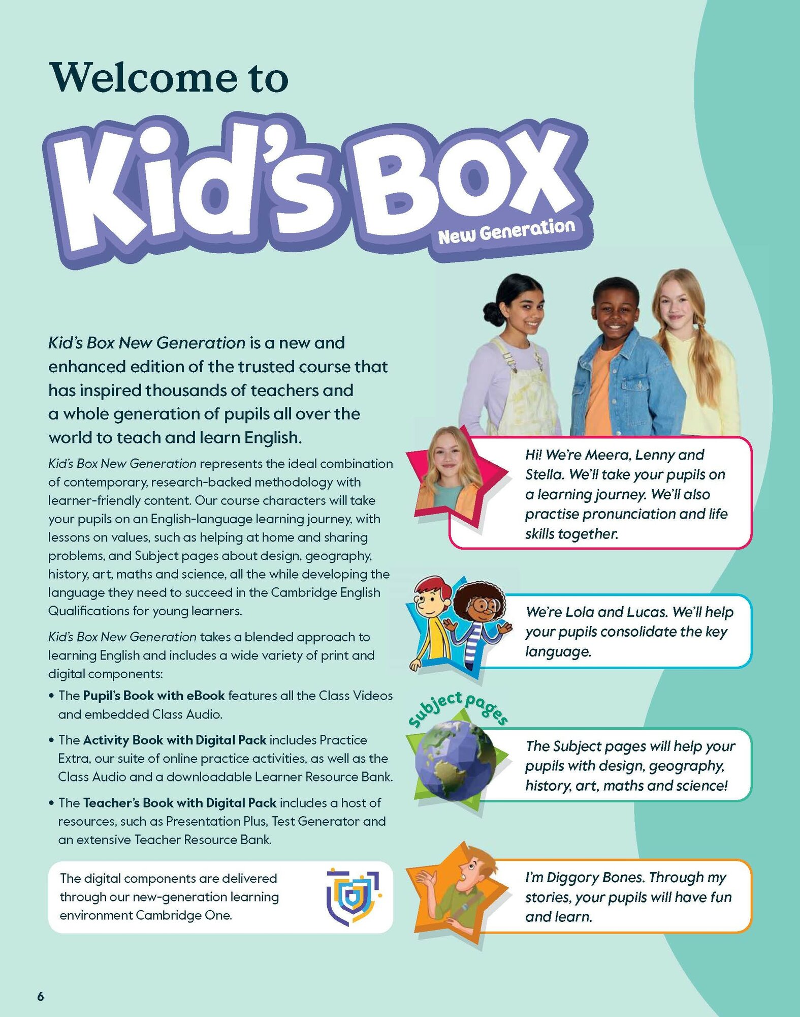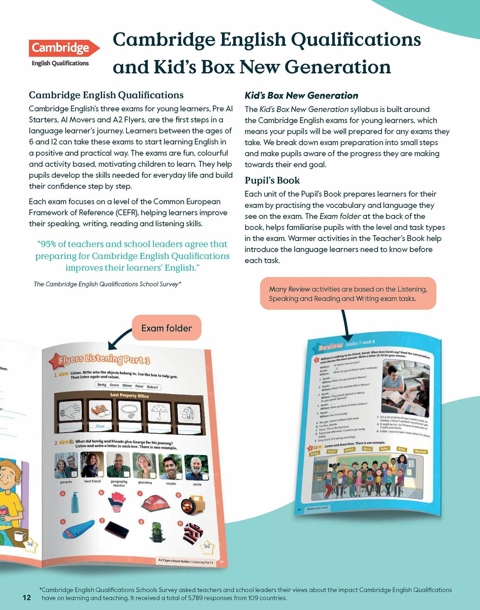 Kid's Box New Generation - это семиуровневый курс общего английского языка, который позволяет учащимся достичь уровня A2 к концу курса. Это также официально утвержденный материал для подготовки к экзаменам, программа которого соответствует требованиям Кембриджской программы подготовки к английскому языку для учеников младших классов.