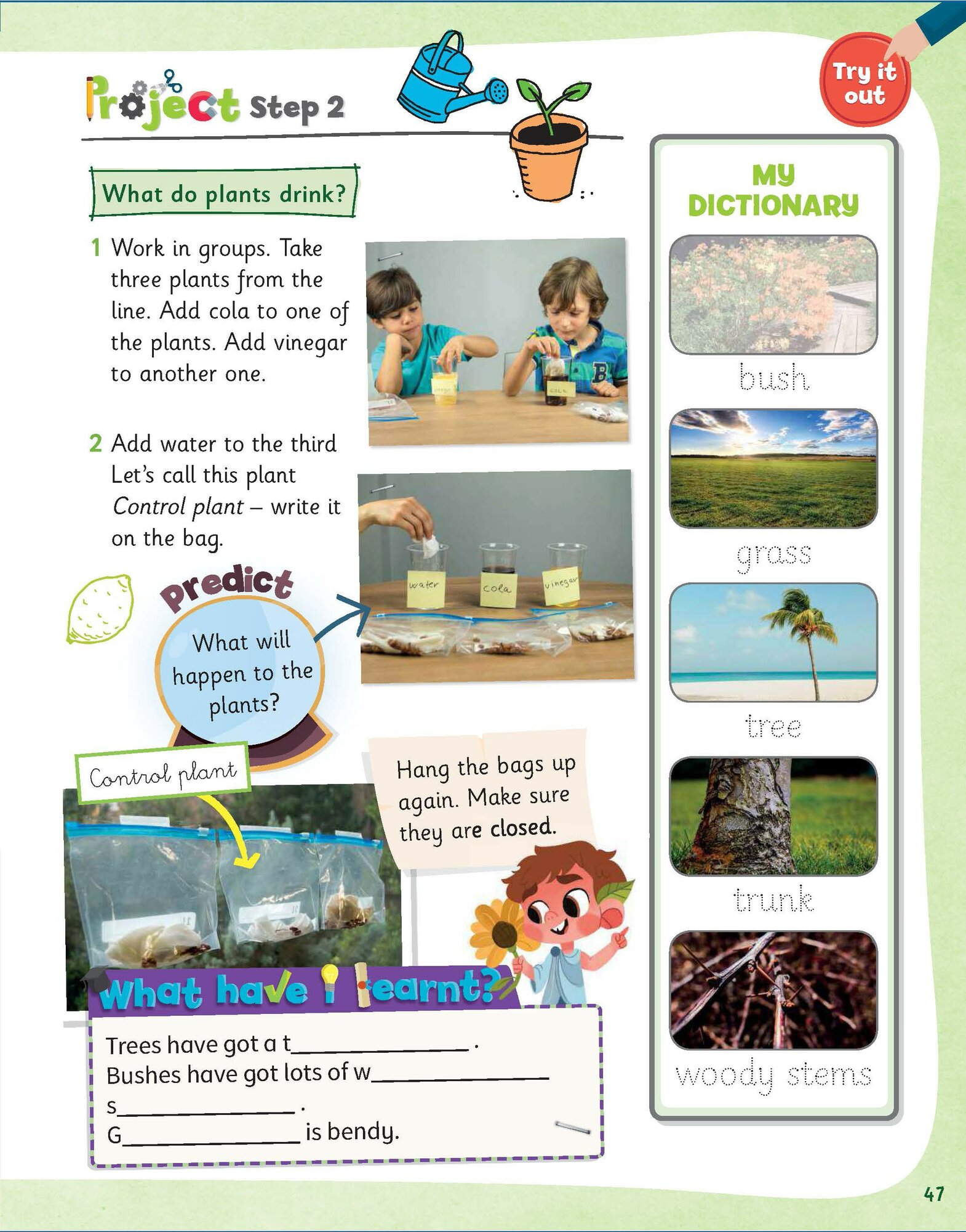 Учебник содержит шесть красиво оформленных разделов с дополнительными блоками для самооценки, мини-проектов и рассказов. Содержание представлено в формате альбома для вырезок, что ближе к тому, как дети усваивают материал вне класса. Подобно журналу, курс включает в себя забавные факты, игры и интересные вопросы (и даже несколько шуток!), чтобы вызвать естественное любопытству детей. Также учебник содержит документальные видеоролики, веселые и практические эксперименты и уроки, посвященные эмоциональному интеллекту.