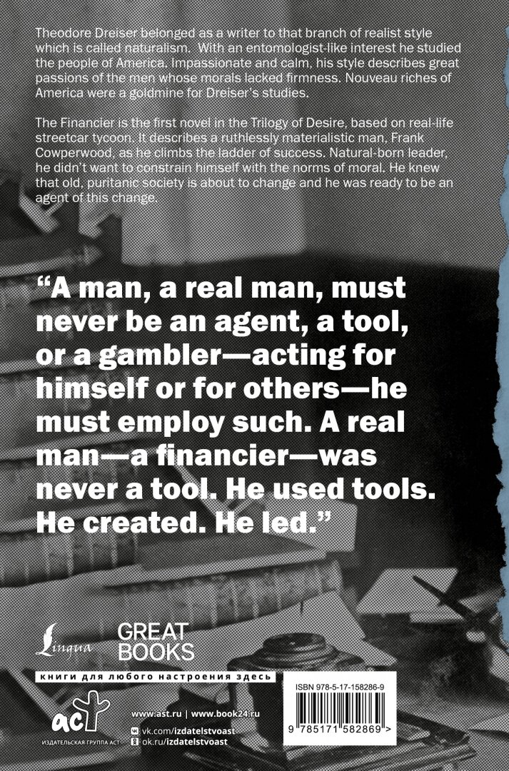 Роман “Финансист” - неоспоримая классика американской литературы. Он явил миру новый тип человека - американского нувориша, который добивается своих целей, даже если это означает идти против правил и законов.