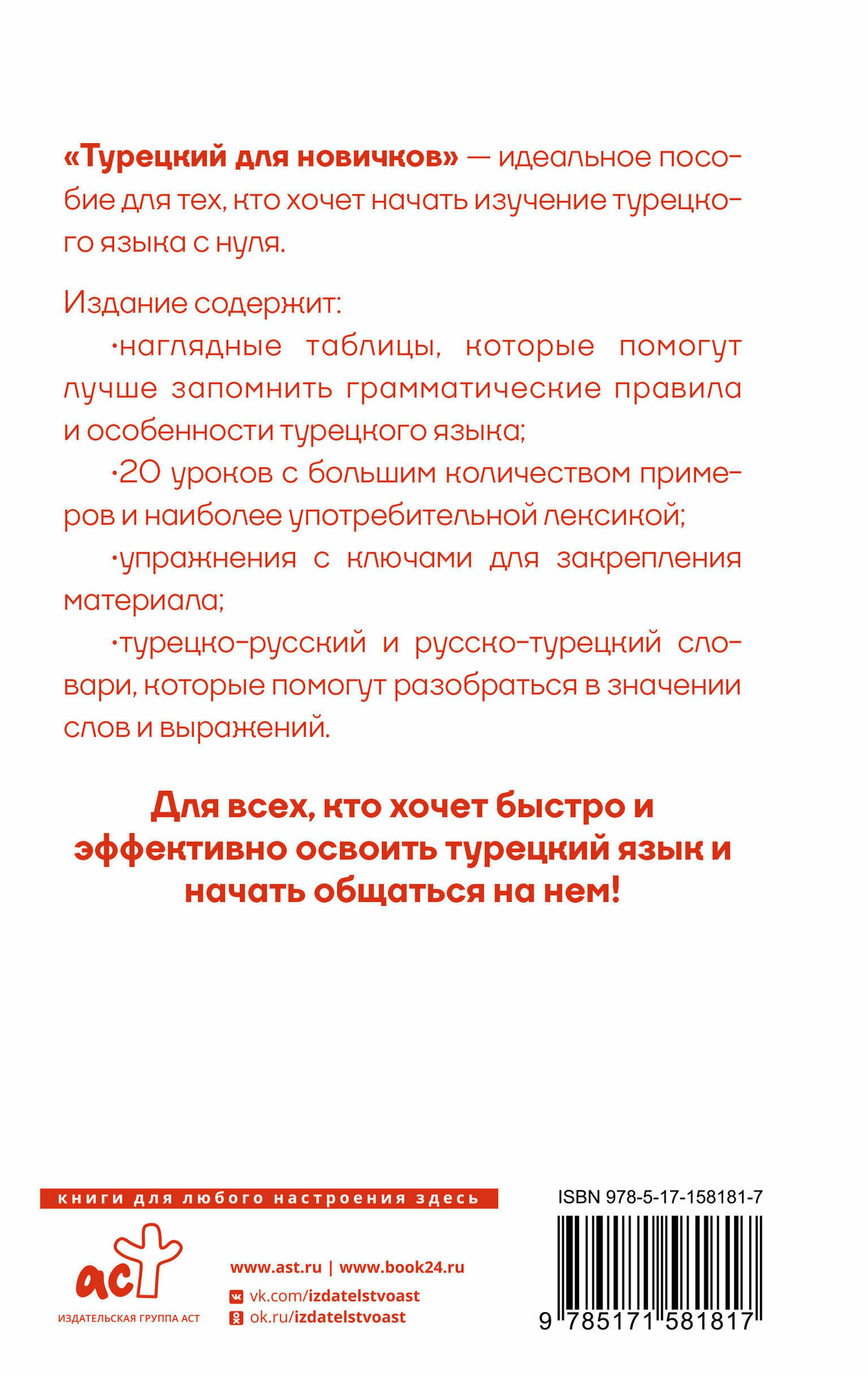 Книга подходит для широкого круга читателей, независимо от возраста и уровня языковых навыков. Она предлагает удобный и понятный формат подачи материала, который поможет вам овладеть турецким языком.