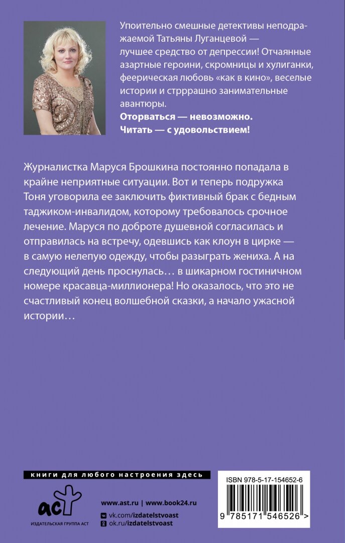 Журналистка Маруся Брошкина постоянно попадала в крайне неприятные ситуации. Вот и теперь подружка Тоня уговорила ее заключить фиктивный брак с бедным таджиком-инвалидом, которому требовалось срочное лечение. Маруся по доброте душевной согласилась и отправилась на встречу, одевшись как клоун в цирке – в самую нелепую одежду, чтобы разыграть жениха. А на следующий день проснулась… в шикарном гостиничном номере красавца-миллионера! Но оказалось, что это не счастливый конец волшебной сказки, а начало ужасной истории…