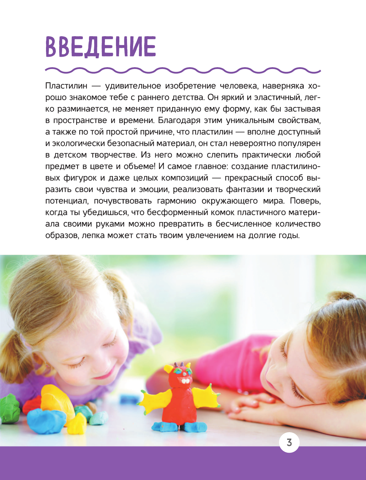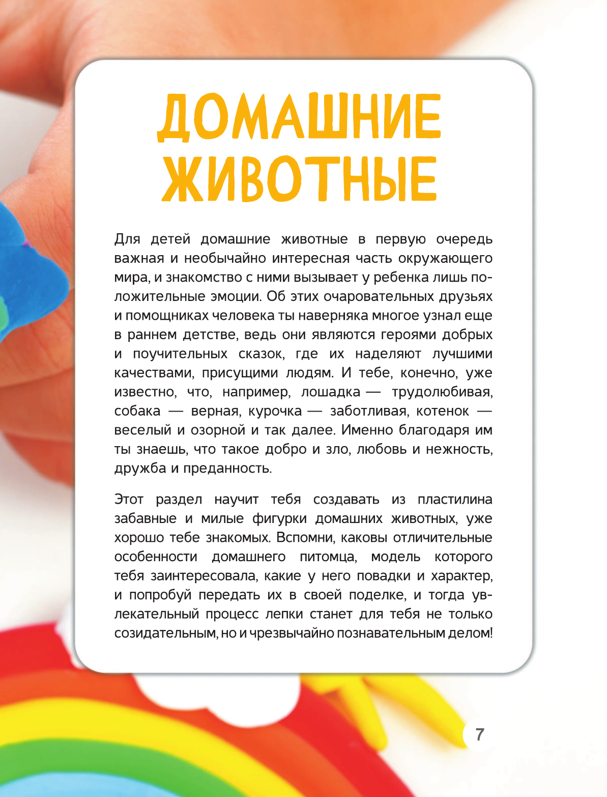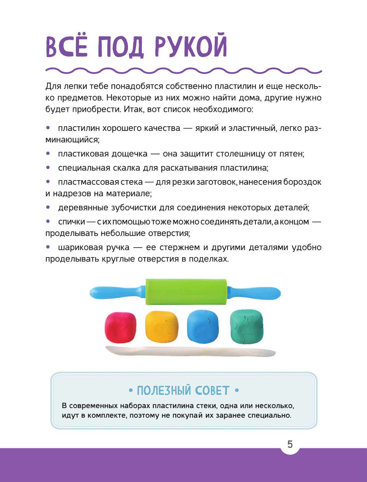 материала домашних питомцев, забавных зверюшек, морских обитателей, машинки и танки, космические корабли, а также составлять аппликации — тематические пластилиновые картины на бумаге. В основе каждой поделки используются элементарные геометрические фигуры, которые дети уже хорошо знают. Последовательно выполняя рекомендации, представленные в книге, они научатся придавать обычным пластилиновым шарикам весьма замысловатые формы. Создавая самые разные модели, ребенок не просто развлекается — он анализирует размеры и пропорции и учится воплощать