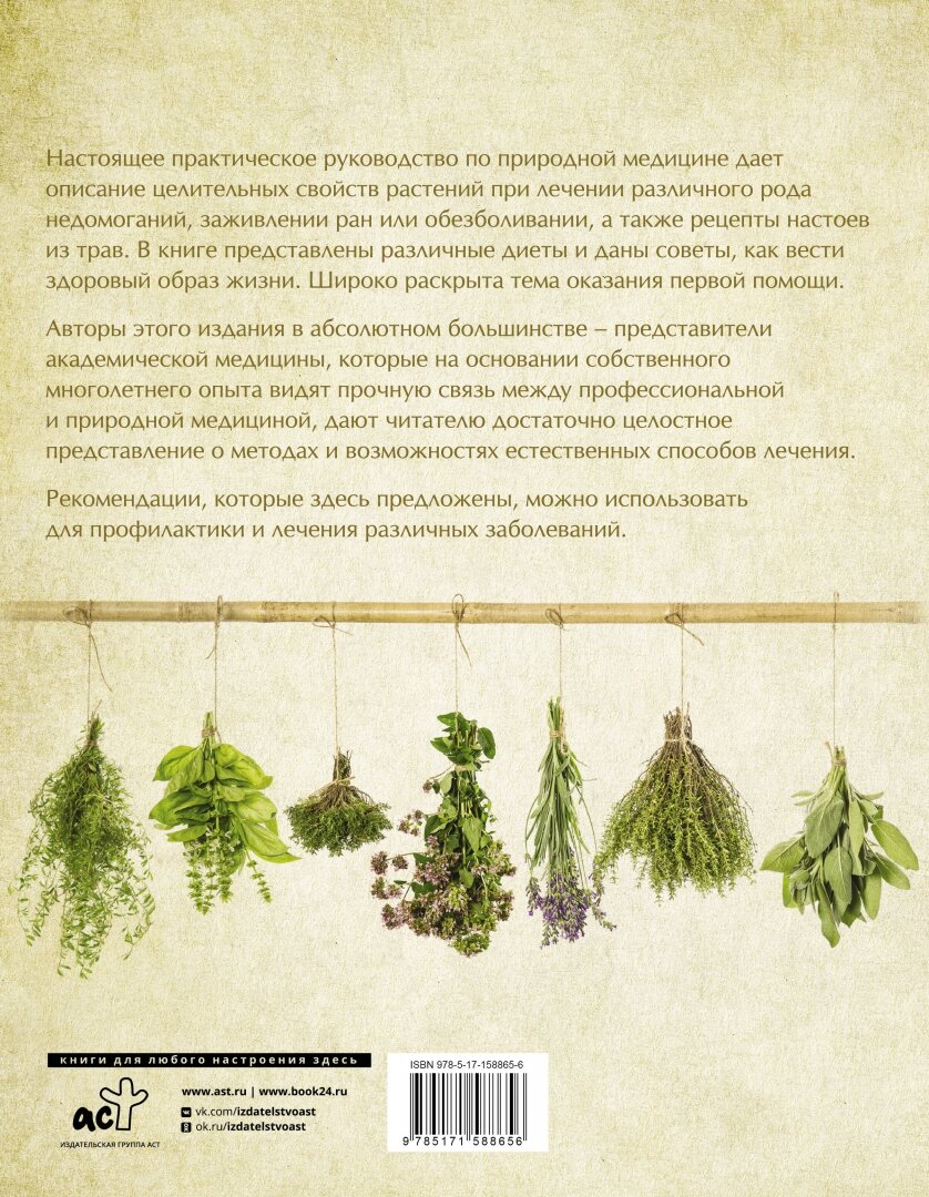 Настоящее практическое руководство по природной медицине даёт описание целительных свойств растений при лечении различного рода недомоганий, заживлении ран или обезболивании, а также рецепты настоев из трав. В книге представлены различные диеты и даны советы, как вести здоровый образ жизни. Широко раскрыта тема оказания первой помощи.