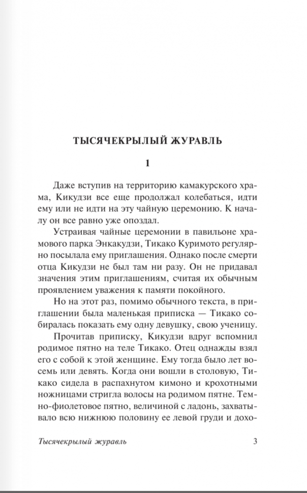 "Отцы ели кислый виноград, а у детей на зубах оскомина" – библейская цитата, удивительно точно передающая "верхний", "сюжетный" слой романа Ясунари Кавабаты "Тысячекрылый журавль". История о нервном, рефлексирующем молодом человеке Кикудзи, которому одна из любовниц покойного отца навязчиво пытается заменить мать и сосватать невесту, другая зачем-то заводит с ним роман, а он влюбляется в ее дочь, испытывающую, в свою очередь, к нему сложные и неоднозначные чувства, в исполнении западного автора изрядно отдавала бы комедией, но Кавабата был японцем, а потому его пронизанный национальной символикой (в которой сквозные образы журавля и чайной церемонии лишь наиболее очевидны) и многочисленными аллюзиями и отсылками к шедеврам хэйанской и самурайской эпохи роман был и остается одним из самых блестящих, аристократически изысканных и неоднозначных произведений прошедшего