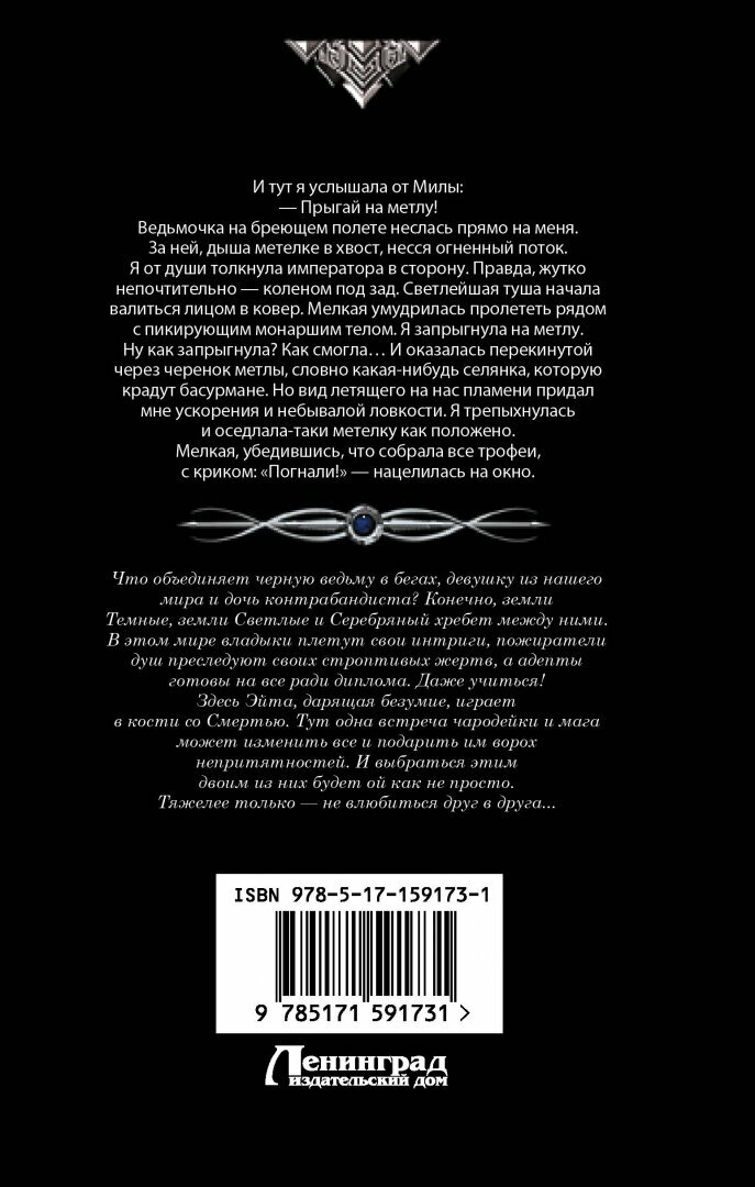 Что объединяет черную ведьму в бегах, девушку из нашего мира и дочь контрабандиста? Конечно, земли Темные, земли Светлые и Серебряный хребет между ними. В этом мире владыки плетут свои интриги, пожиратели душ преследуют своих строптивых жертв, а адепты готовы на все ради диплома. Даже учиться! Здесь Эйта, дарящая безумие, играет в кости со Смертью. Тут одна встреча чародейки и мага может изменить все и подарить им ворох непритятностей. И выбраться этим двоим из них будет ой как не просто. Тяжелее только — не влюбиться друг в друга...