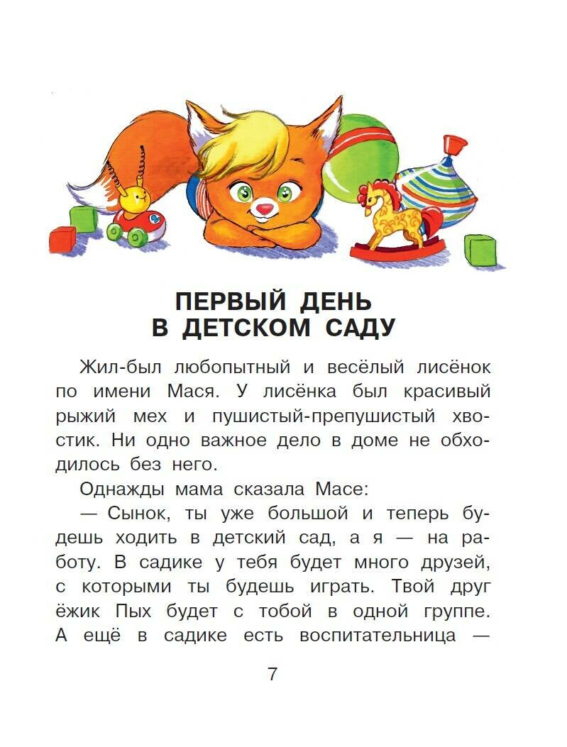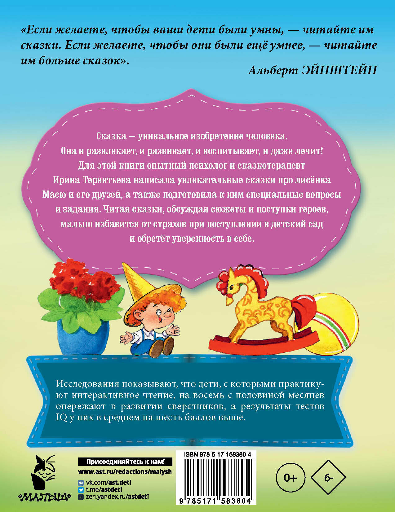Как подготовить ребёнка к детскому саду? Опытный педагог, психолог и сказкотерапевт Ирина Терентьева подскажет, как справиться с этой проблемой. Слушая увлекательные сказки про лисёнка Масю и его друзей и отвечая на специальные вопросы, ребёнок начнёт сравнивать себя с персонажами и на их примере будет учиться взаимодействовать с окружающим миром. Сказки помогут малышу избавиться от страхов и придадут ему уверенность в себе. А красочные иллюстрации Нины Князевой подарят позитивные эмоции от общения с книгой.