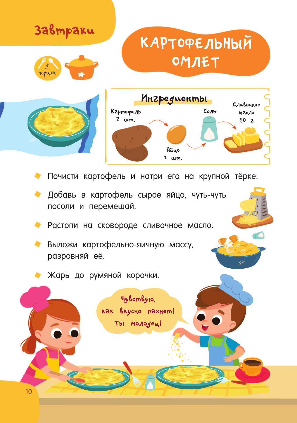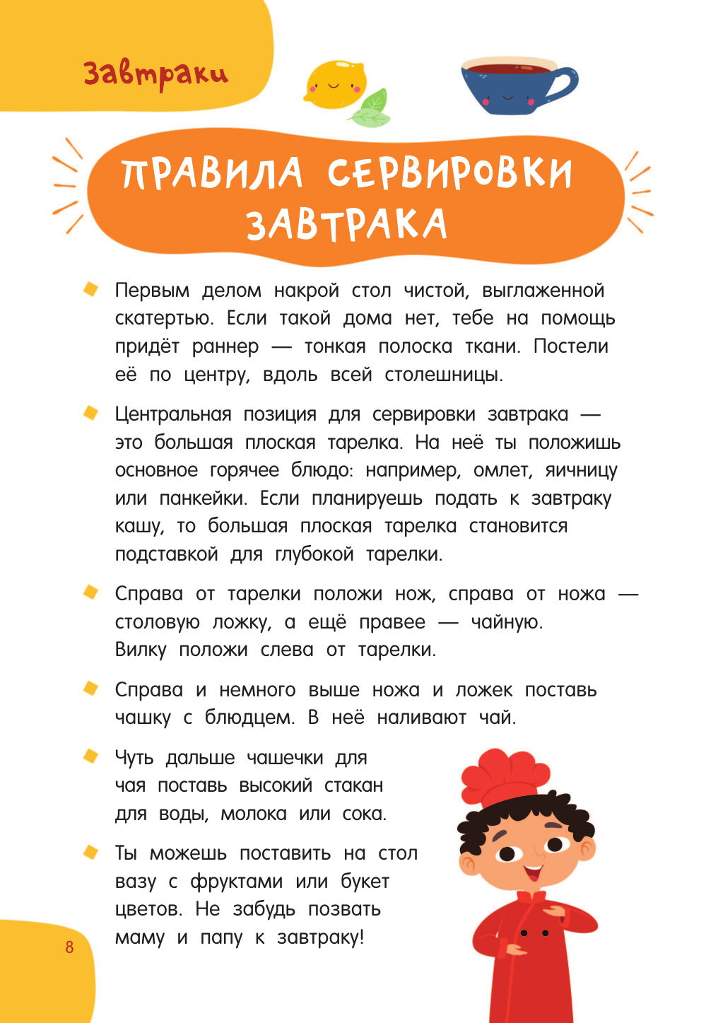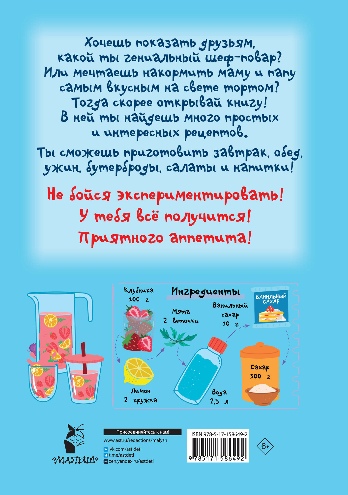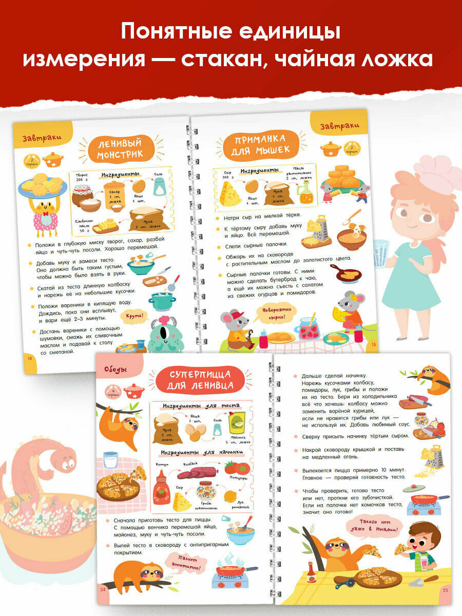 "Первая кулинарная книга: готовлю сам без мамы" — настоящая находка для юных шеф-поваров и их родителей. Под обложкой более 60 разнообразных рецептов с пошаговым описанием: завтраки, обеды, ужины, десерты, бутерброды, салаты, напитки и многое другое. Понятные ребенку единицы измерения — стакан, чайная ложка. Яркие иллюстрации, выполненные в стиле современных мультфильмов.