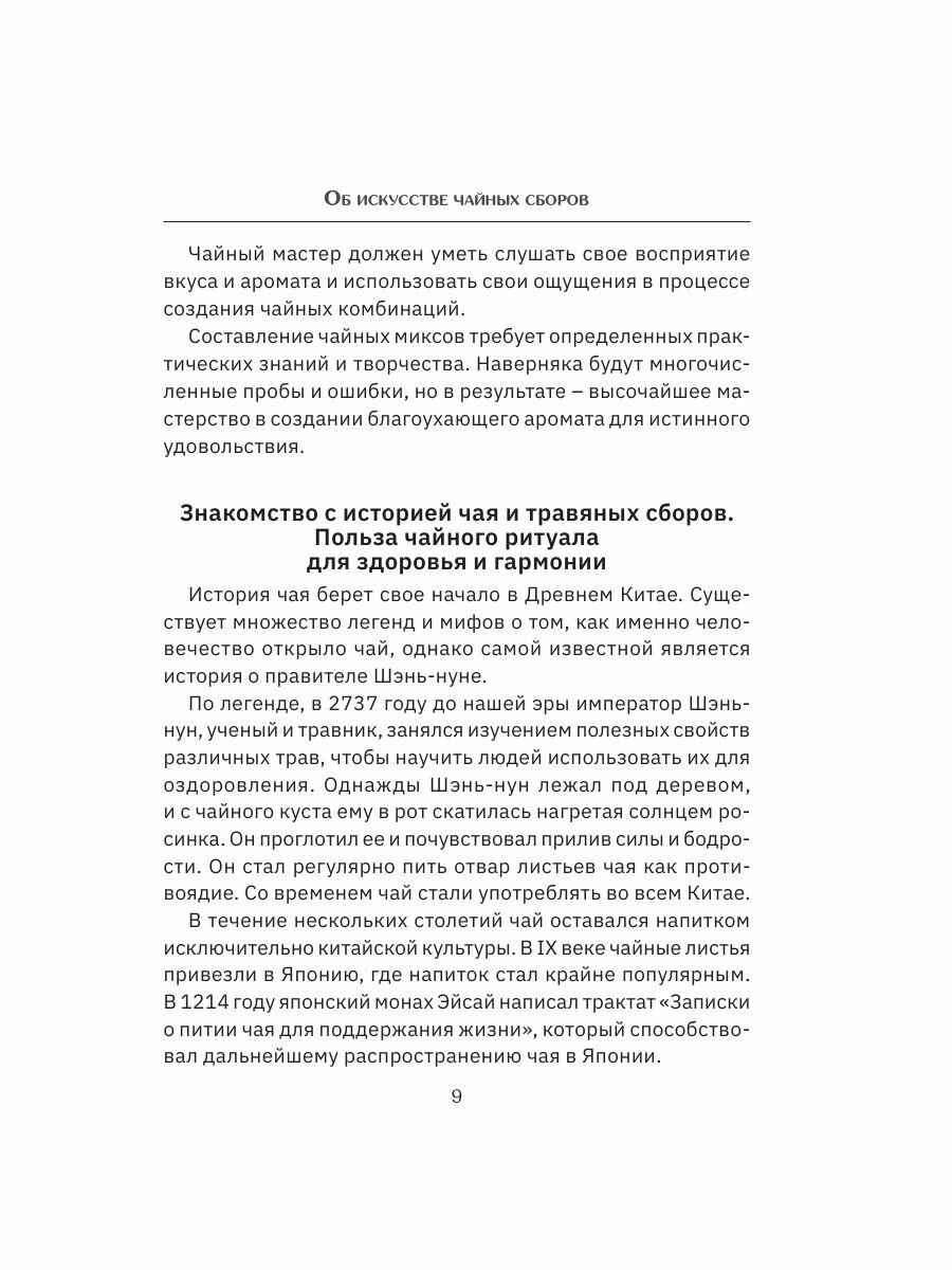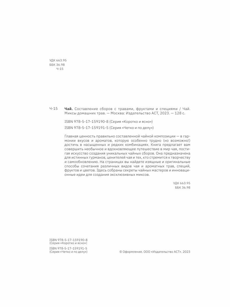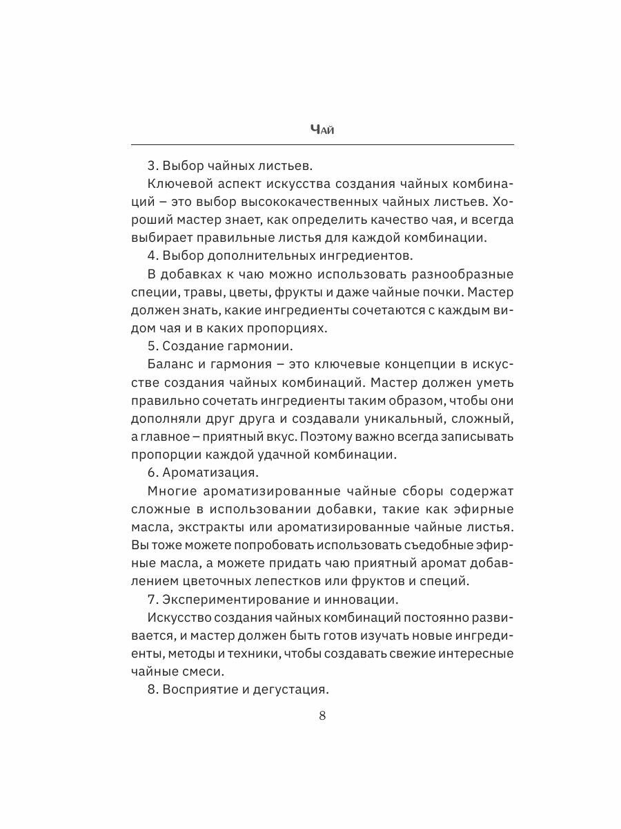 Главная ценность правильно составленной чайной композиции – в гармонии вкусов и ароматов, которую особенно трудно (но возможно!) достичь в насыщенных и редких комбинациях. Книга предлагает вам совершить необычное и вдохновляющее путешествие в мир чая, постигая искусство создания уникальных чайных сборов. Она предназначена для истинных гурманов, ценителей чая и тех, кто стремится к творчеству и самообновлению. На страницах вы найдете изящные и оригинальные способы сочетания различных видов чая и ароматных трав, здесь собраны секреты чайных мастеров и инновационные идеи для создания эксклюзивных миксов.
