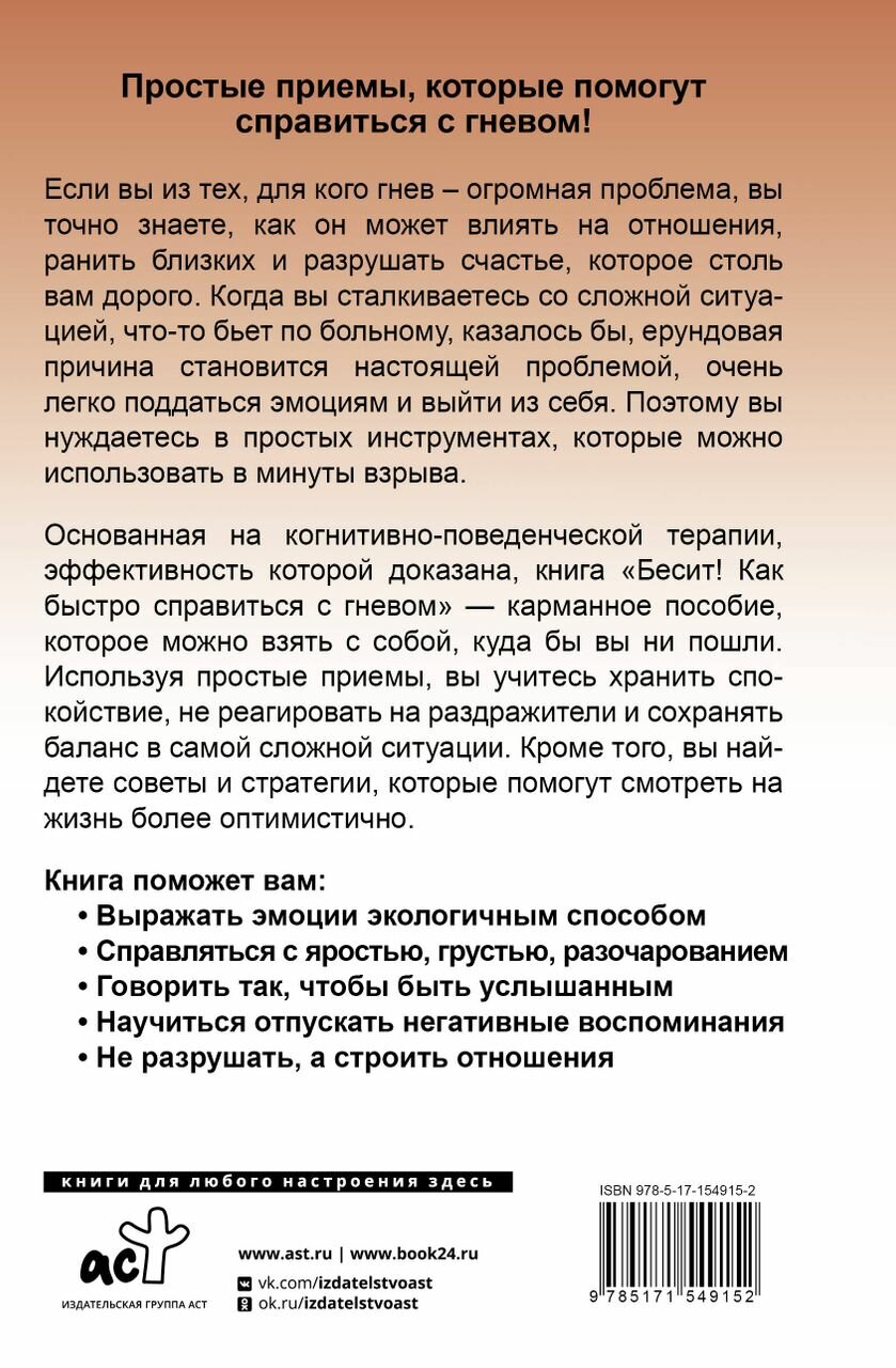 Основанная на когнитивно-поведенческой терапии, эффективность которой доказана, книга "Бесит! Как быстро справиться с гневом" — карманное пособие, которое можно взять с собой, куда бы вы ни пошли. Используя простые приемы, вы учитесь хранить спокойствие, не реагировать на раздражители и сохранять баланс в самой сложной ситуации. Кроме того, вы найдете советы и стратегии, которые помогут смотреть на жизнь более оптимистично.