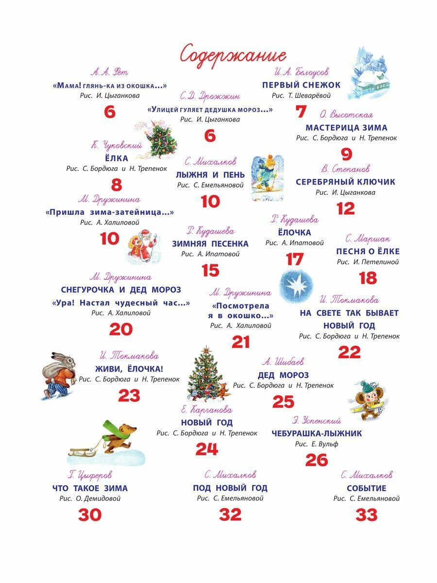 В сборник вошли самые лучшие стихи и сказки о зиме, ёлочке-красавице, Новом годе и главных героях праздника – дедушке Морозе и Снегурочке. Произведения сборника написаны классиками детской литературы, такими, как С. Маршак, С. Михалков, К. Чуковский, Э. Успенский и другие, а также современными писателями и поэтами – Галиной Дядиной, М. Дружининой, Е. Григорьевой и Е. Ермоловой. Книга станет отличным подарком детям, а также поможет при подготовке к семейному торжеству или утренникам в школе и детском саду.