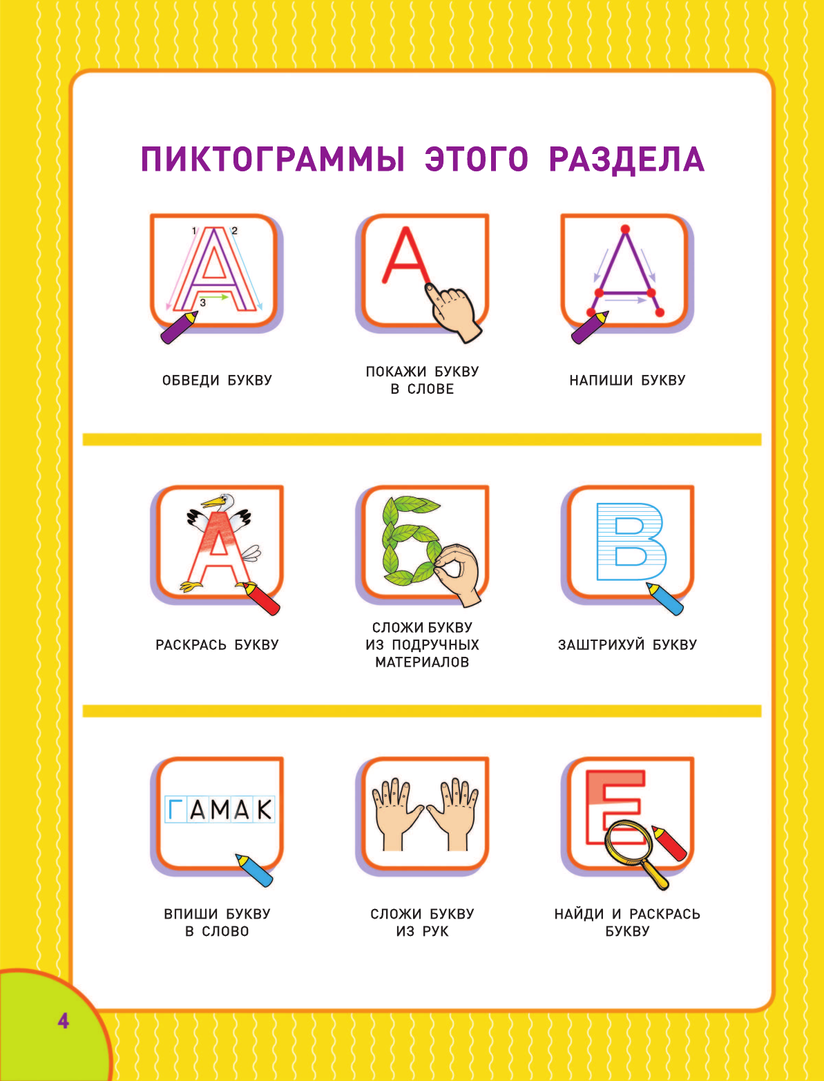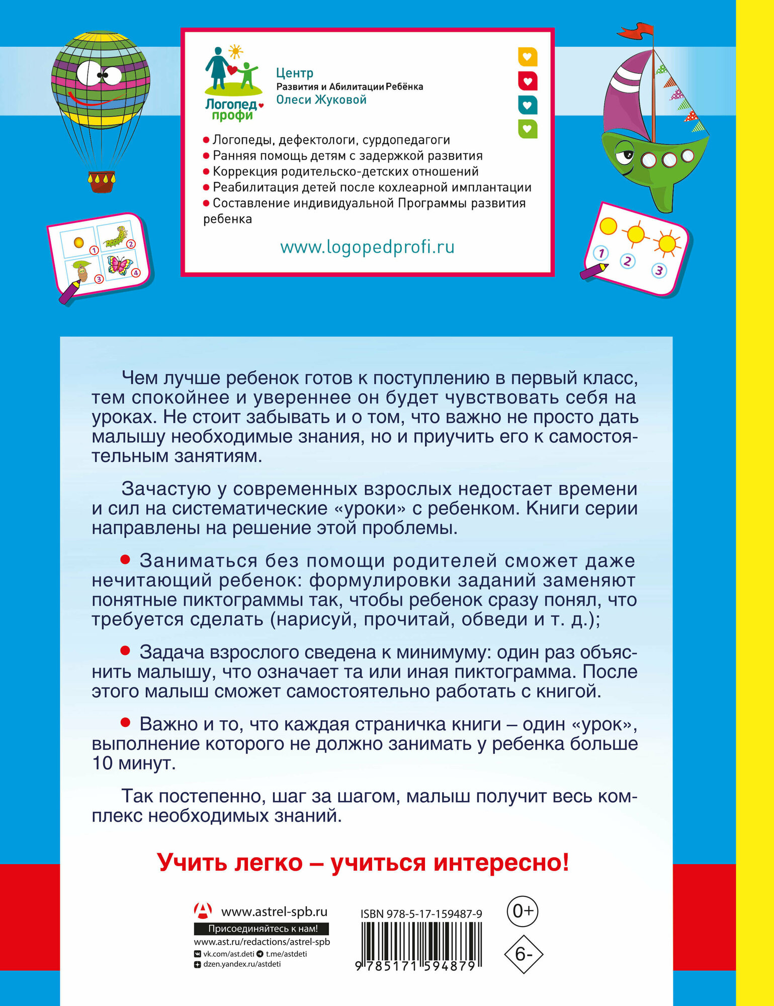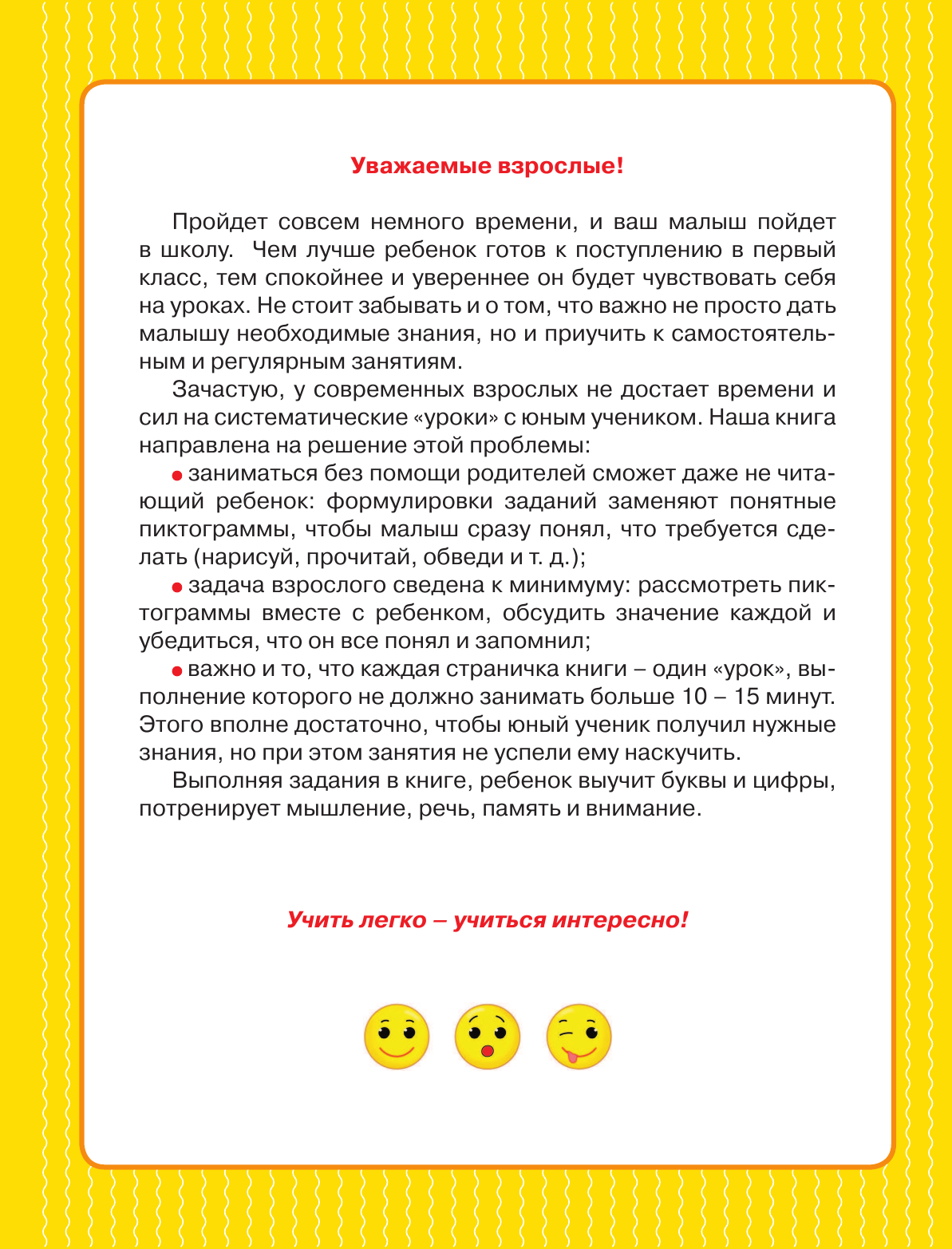 Книга создана специально для занятых родителей. Ребенок вполне сможет заниматься без помощи взрослых: формулировки заданий заменяют понятные пиктограммы так, чтобы малыш сразу понял, что требуется сделать (нарисуй, напиши, обведи и т. д.). Такие занятия приучают детей к самостоятельному выполнению заданий, что является важнейшим навыком для будущих первоклассников.