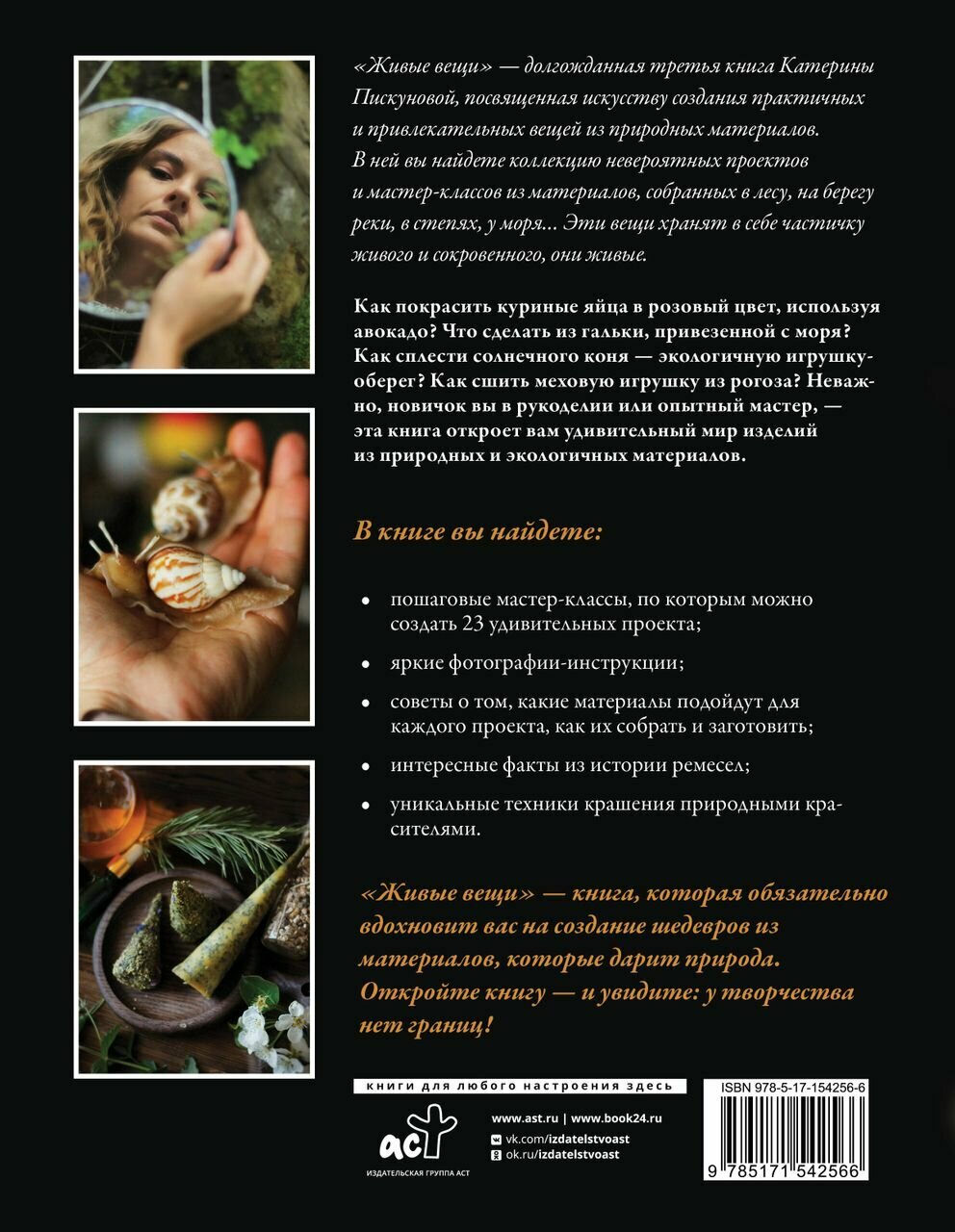 «Живые вещи» — книга, в которой собрана коллекция из 23 невероятных проектов и мастер-классов из материалов, собранных в лесу, на берегу реки, в степях, у моря… Эти вещи хранят в себе частичку живого и сокровенного, они живые. В книге вы найдете пошаговые мастер-классы, яркие фотографии-инструкции, cоветы о том, какие материалы подойдут для каждого проекта, как их собрать и заготовить; интересные факты из истории ремесел, а также уникальные техники крашения природными красителями. Откройте книгу — и увидите: у творчества нет границ!