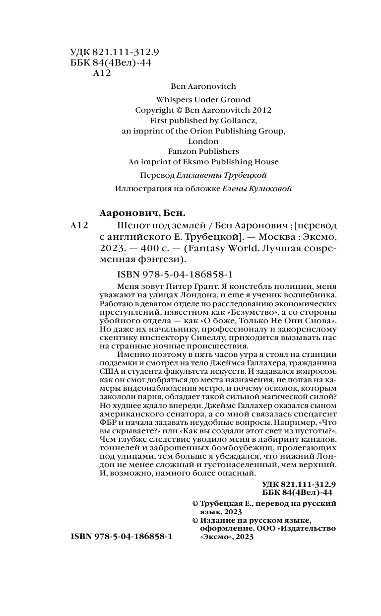 Книга: Шепот под землей (Бен Ааронович); Эксмо, Fanzon, Редакция 1, 2023