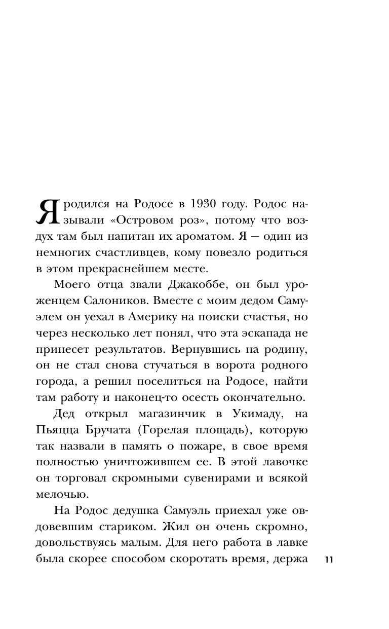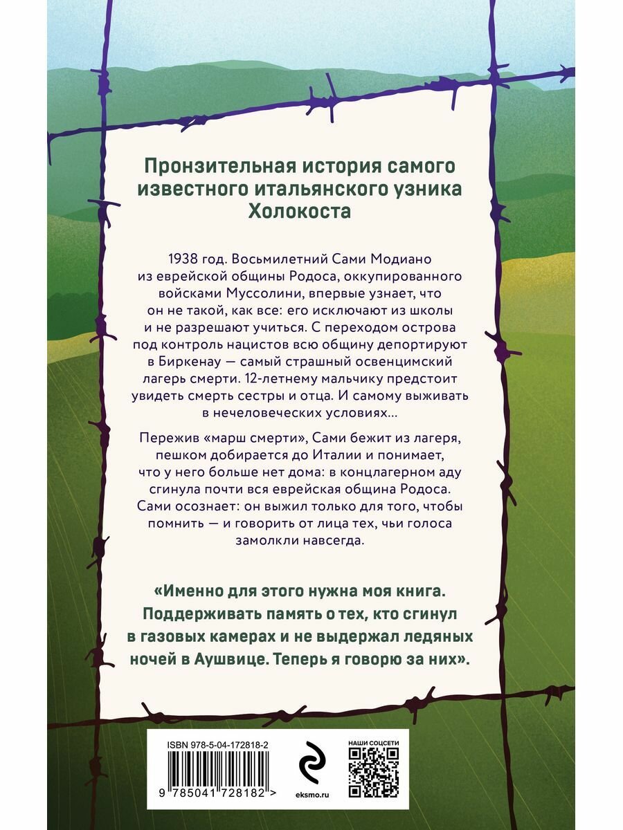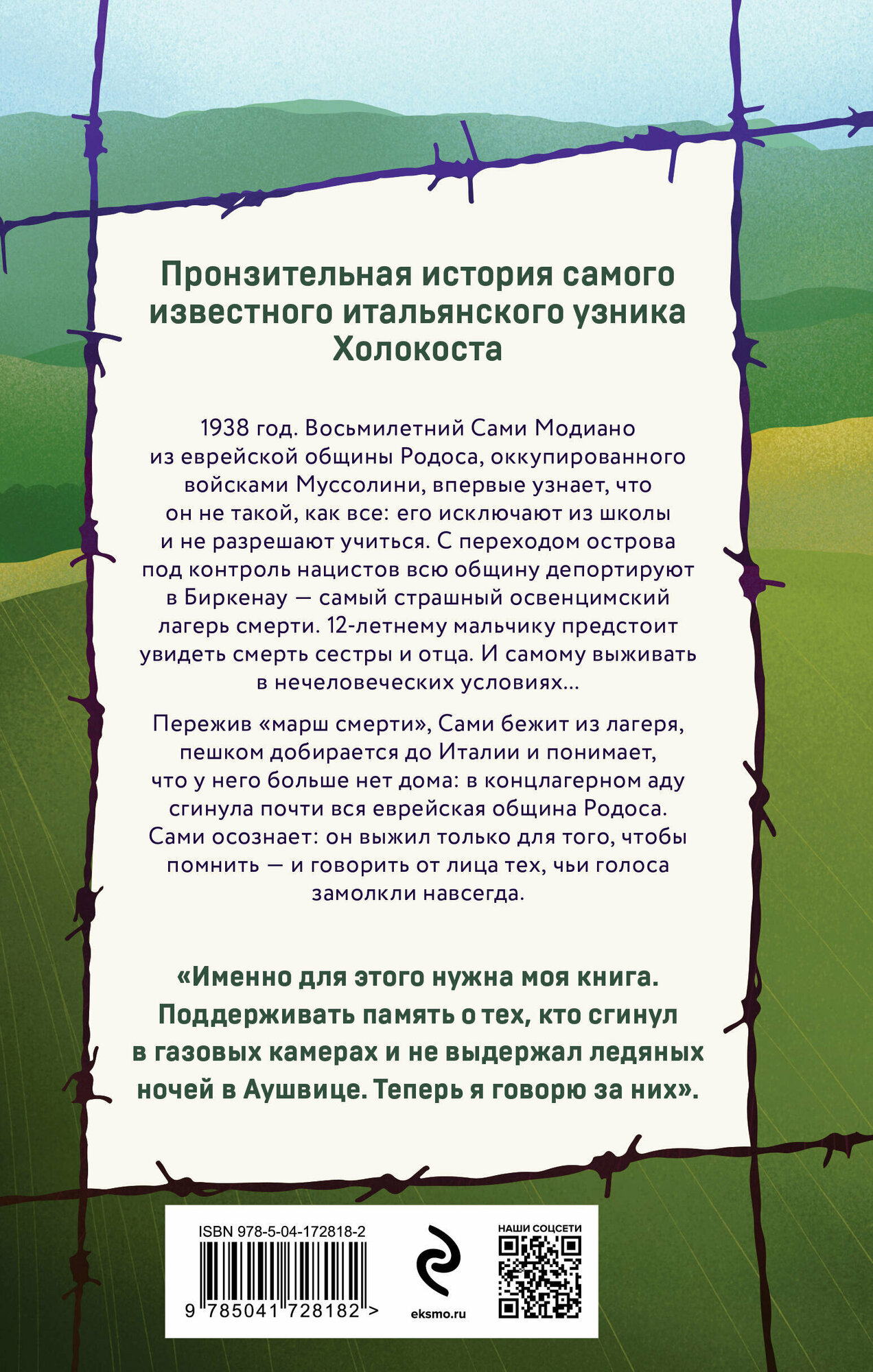 Пронзительная история самого известного итальянского узника Холокоста — об ужасах Аушвица, потере всей семьи и странствиях в поисках новой жизни 1938 год. Восьмилетний Сами Модиано из еврейской общины Родоса, оккупированного войсками Муссолини, впервые узнает, что он не такой, как все: его исключают из школы и больше не разрешают учиться. Через несколько лет остров переходит под контроль нацистов, и общину депортируют в Биркенау, самый страшный освенцимский лагерь смерти. Двенадцатилетнему мальчику предстоит пережить разлуку с сестрой и видеть медленное угасание отца. И самому выживать в нечеловеческих условиях... Пережив «марш смерти» и бежав из лагеря, Сами оказывается на линии фронта с советской армией. А затем пешком добирается до Италии — только чтобы осознать, что у него больше нет дома: в концлагерном аду сгинула почти вся еврейская община Родоса... Спустя годы скитаний и тяжелого труда он понимает: единственный способ примириться со своим прошлым — это помнить. И говорить от лица тех, чьи голоса замолкли навсегда. «Именно для этого нужна моя книга. Поддерживать память о тех, кто сгинул в газовых камерах и не выдержал ледяных ночей в Аушвице. Теперь я говорю за них». ------------------------------ «"В этот день я словно потерял невинность: утром проснулся еще ребенком, а спать лег уже евреем". Вот как Сами Модиано, переживший Холокост, вспоминает тот день, когда из-за расовых законов его выгнали из школы на Родосе. Это был только первый шаг к ужасу. Фактически Сами был одним из 2500 евреев общины Родоса, депортированных в Биркенау. И один из очень немногих выживших. "Почему я?" — задается он вопросом снова семьдесят лет спустя. Единственный ответ — чтобы рассказать. Чтобы не забыть». — Corriere de la Sera