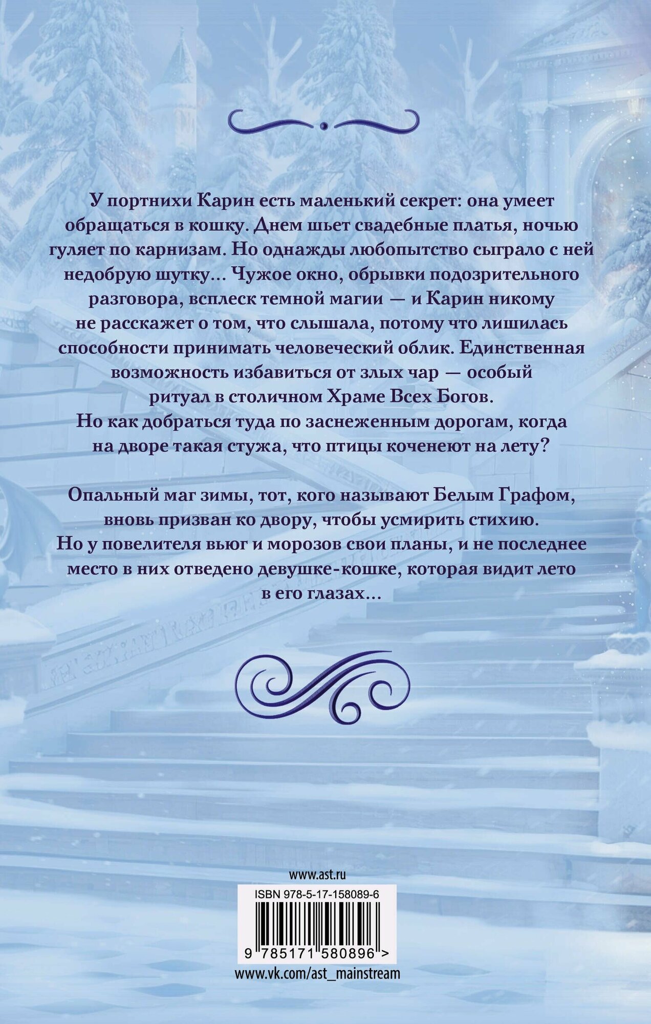 У портнихи Карин есть маленький секрет: она умеет обращаться в кошку. Днем шьет свадебные платья, ночью гуляет по карнизам. Но однажды любопытство сыграло с ней недобрую шутку… Чужое окно, обрывки подозрительного разговора, всплеск темной магии — и Карин никому не расскажет о том, что слышала, потому что лишилась способности принимать человеческий облик. Единственная возможность избавиться от злых чар — особый ритуал в столичном Храме Всех Богов.
