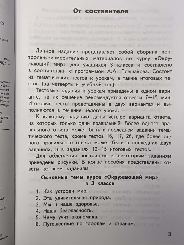 В пособии представлены контрольно-измерительные материалы по курсу «Окружающий мир»для 3 класса. Порядок тем соответствует учебнику А.А. Плешакова (УМК «Школа России»), входящему в действующий федеральный перечень учебников. Все задания соответствуют программе общеобразовательных организаций и требованиям ФГОС-2021 для начальной школы. Систематическая работа с материалами сборника позволит обучить школьников работес тестами, что поможет в дальнейшем успешно выполнить задания государственной аттестации. В конце пособия даны ответыко всем заданиям. Издание адресовано учителям начальных классов, школьникам и их родителям.