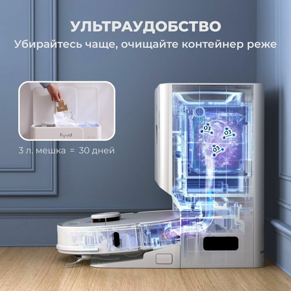 Стерилизация озоном и ионами серебра обеспечивает чистоту и гигиеничность пылесборных мешков и швабр. Этот уникальный набор функций обеспечивает автономную уборку дома. Автоматизация, которая делает здоровый образ жизни доступнее. Самоочистка: продуманная автоматическая система нагнетает воздух в пылесборник пылесоса и всасывает мусор в мешок для сбора пыли, обеспечивая вам до 30 дней автономной работы, вообще без вашего участия. Удобный и гигиеничный способ чистки пылесборника, с которым вам не придется пачкать руки. Автоматическая мойка и сушка швабры: для влажной уборки робот оснащен двумя роторными швабрами. Встроенная мойка и сушка позволит не заниматься их обслуживанием вручную: док-станция регулярно моет накладки чистой водой по 6/9/12 минут в зависимости от степени загрязнения. После этого швабры сушатся горячим воздухом, что помогает предотвратить возникновение неприятных запахов и размножение бактерий.