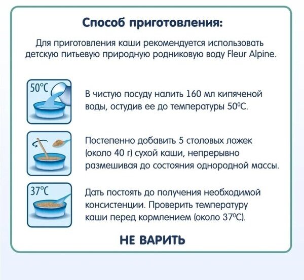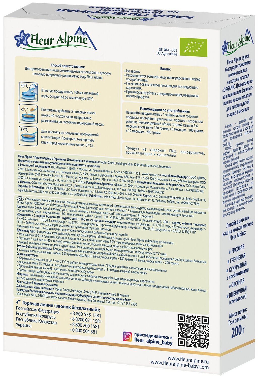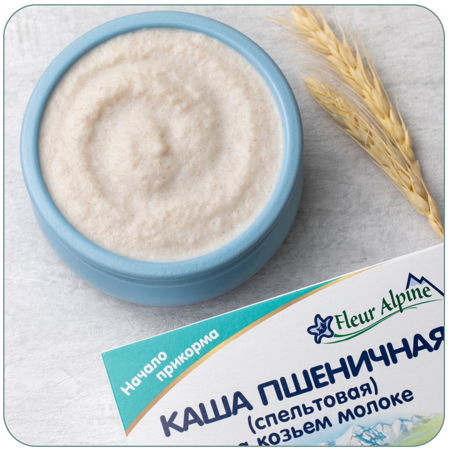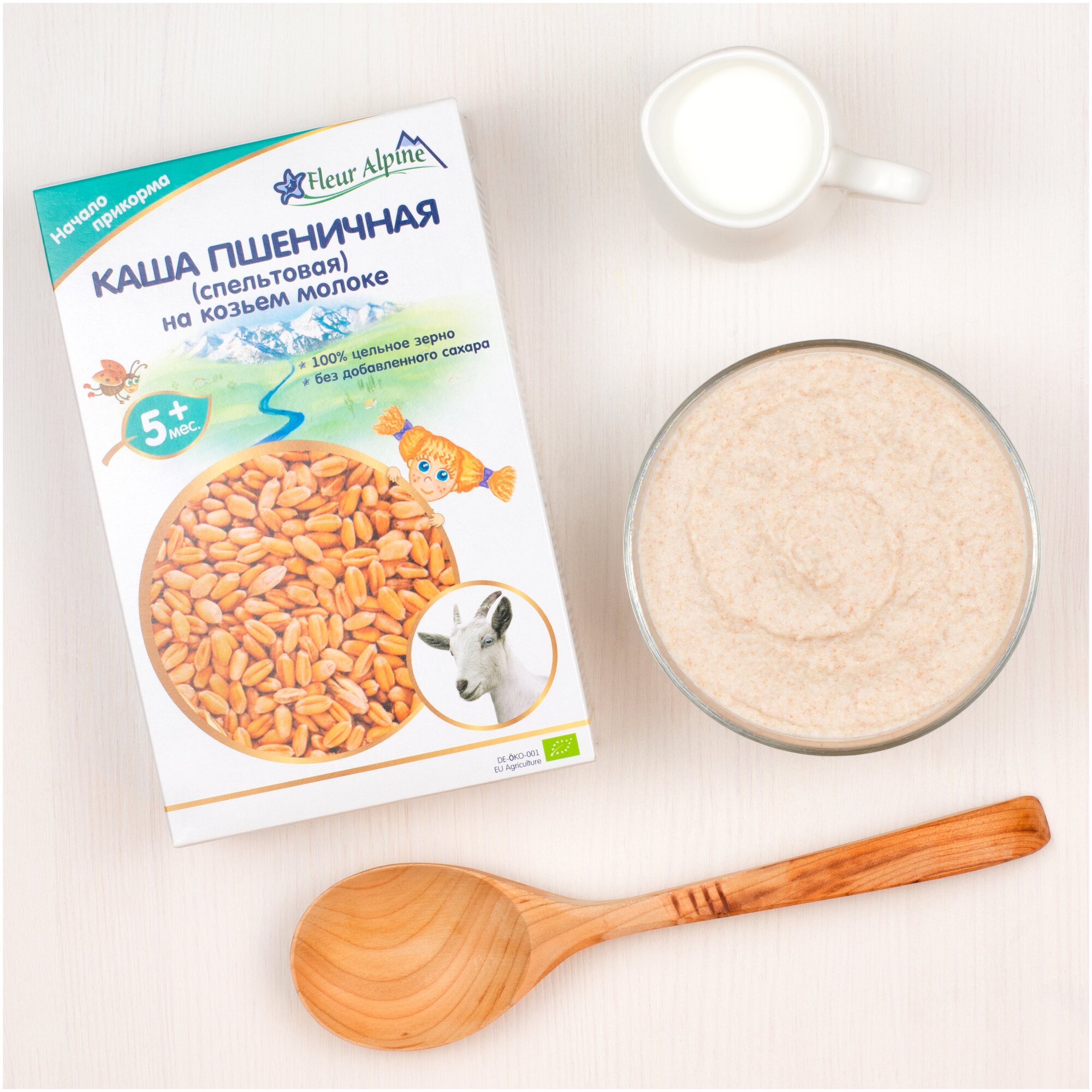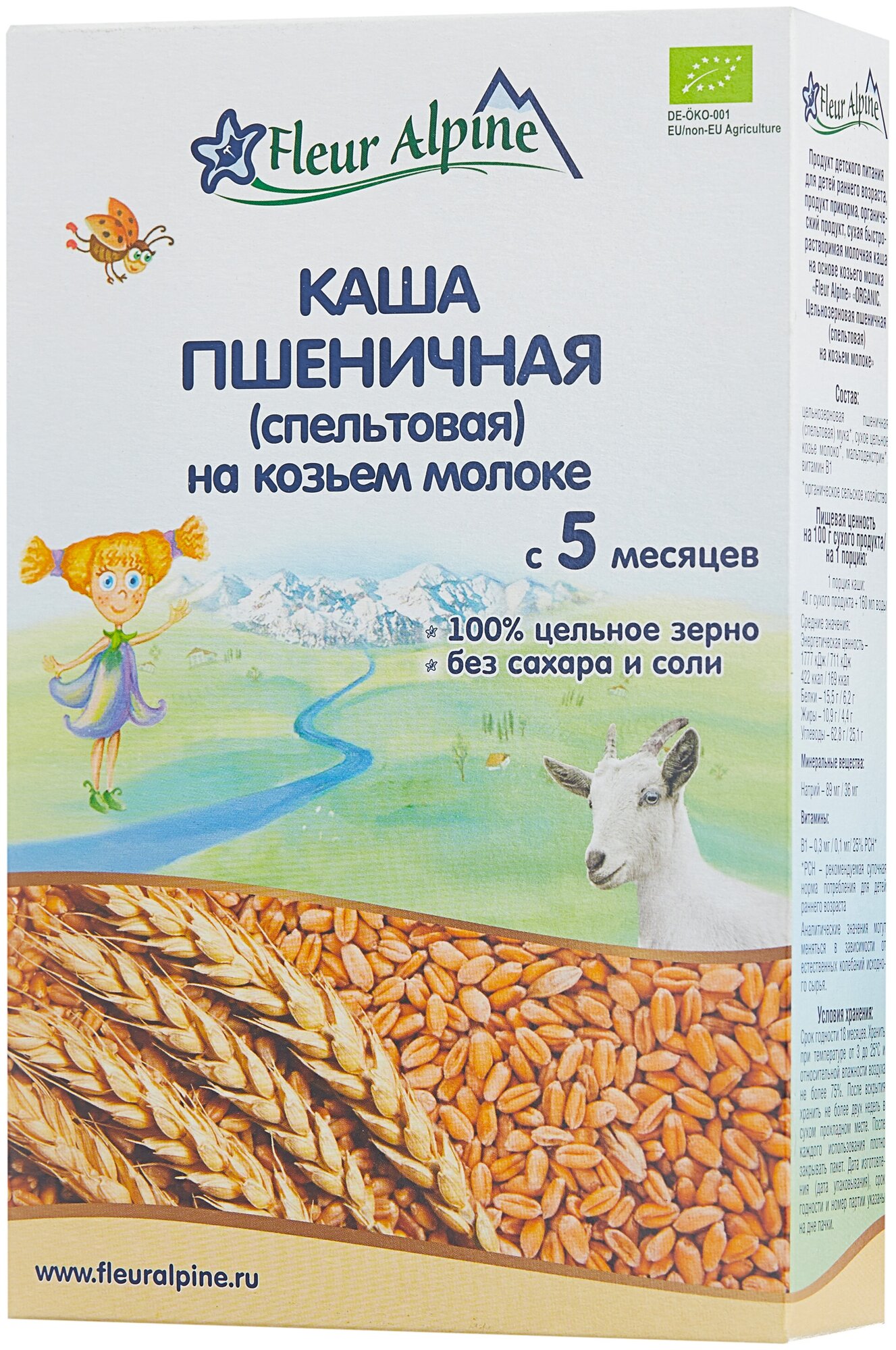 Каша на козьем молоке Fleur Alpine ПШЕНИЧНАЯ (спельтовая) для детей с 5 мес.: Без добавленного сахара, Изготовлена из высококачественного цельного зерна, Разводится легко, быстро и без комочков, Органический продукт, произведен в Германии и сертифицирован в соответствии с Регламентом ЕС 2018/848. ВАЖНО: при вводе прикорма необходима консультация педиатра. При отсутствии у ребенка аллергии на молочный белок ПШЕНИЧНУЮ кашу на козьем молоке можно вводить в качестве первого злакового прикорма. Цельное молоко альпийских козочек в составе придает каше натуральную сладость, нежный сливочный вкус и аромат, способствует длительному насыщению. Нежная, воздушная консистенция готовой каши в виде сугробиков напоминает снег, который ложится на поверхность небольшими пышными неровностями.