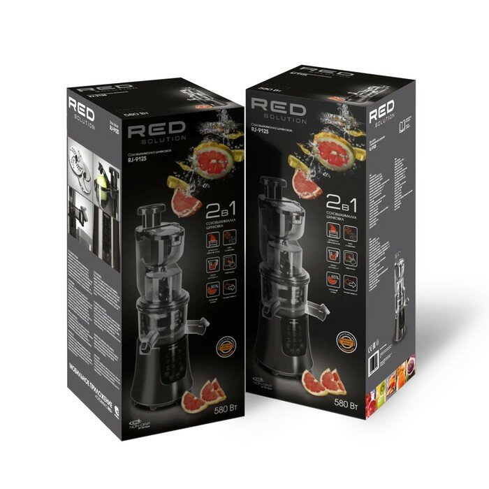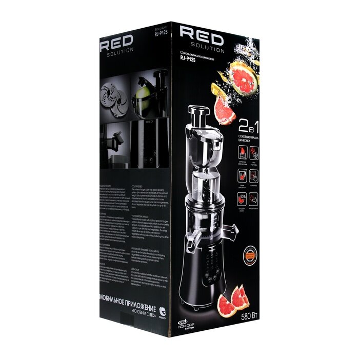 | Прочие особенности и свойства | Шнековая соковыжималка RED solution RJ-912S – мощный прибор «2 в 1», предназначенный как для отжима сока из овощей и фруктов, так и для шинковки продуктов. Удобная сенсорная панель управления на корпусе прибора позволяет быстро переключить RJ-912S с одного режима работы на другой. Например, мгновенно переходить от отжима сока из твердых плодов к отжиму сока из мягких овощей и фруктов., 9 программ., Функция самоочистки., Функция реверса., Защита от включения при неправильной сборке., Функция «Капля-стоп». |