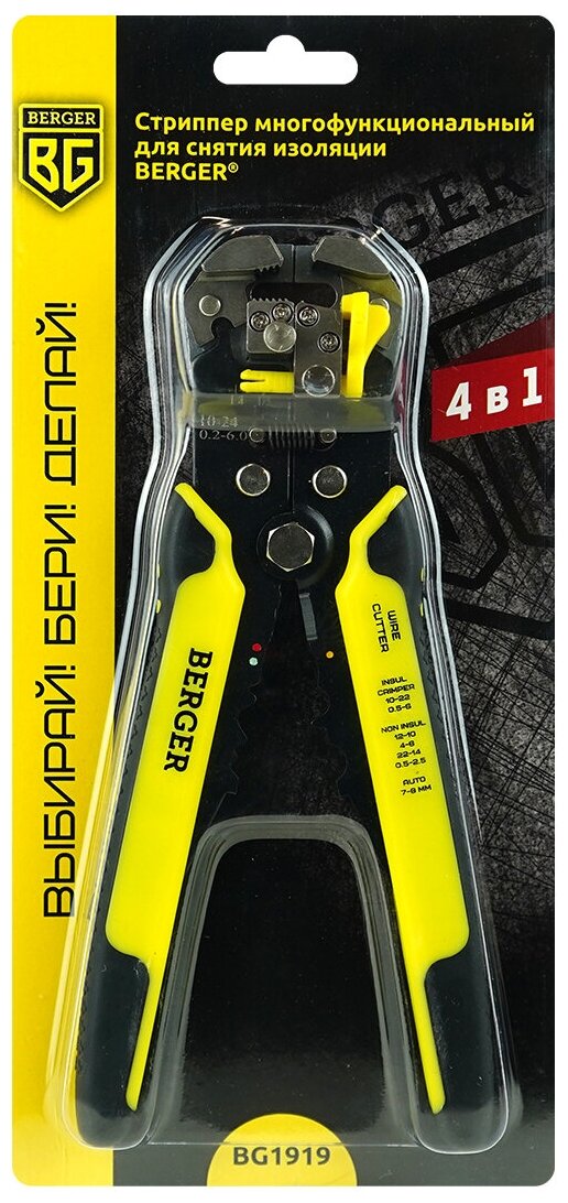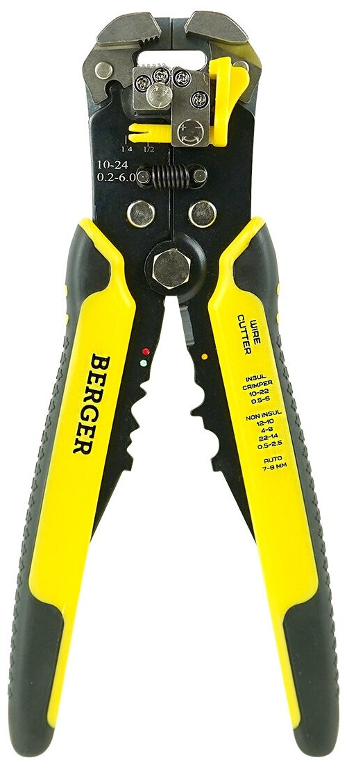 Автоматический многофункциональный инструмент 4 в 1:– снятие изоляции с проводов сечением 0,2 – 6 мм2 (одновременно до 3-х проводов)– резка кабеля до 8 мм2– снятие оболочки с плоских проводов до 8 мм2– опрессовка наконечников 0.5–6.0 мм2— размер: 205 мм— автоматическая настройка на нужный размер и толщину изоляции проводов в диапазоне 0.2–6 мм2— винт микронастройки для снятия изоляции с проводов сечением от 0,05 мм2 до 8мм2— винт регулировки ограничителя длины провода для зачистки заданного размера изоляции— окно для сброса обрезков изоляции— не повреждает жилы проводов при снятии изоляции.— обжим наконечников:изолированные наконечники: 0,5 – 6 мм2неизолированные наконечники: 0,5 – 6 мм2автомобильные клеммы: 7 – 8 мм— эргономичные двухкомпонентные нескользящие рукоятки