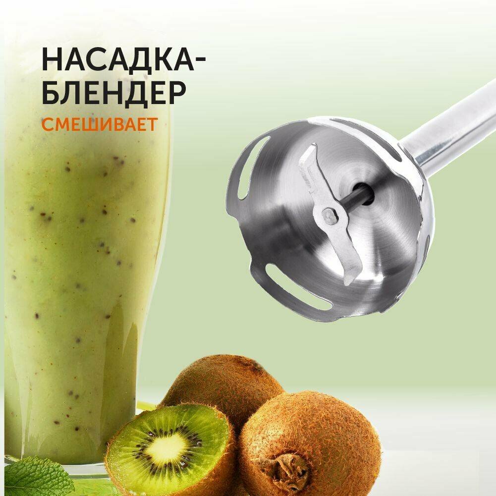 | Насадки | насадка кухонный комбайн, насадка-блендер, насадка-венчик, насадка-вспениватель молока, насадка с двумя венчиками, измельчитель. |