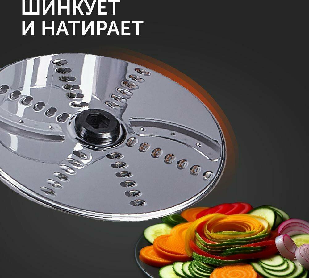 S-образные ножи измельчителя и комбайна, терка и нож насадки-блендера выполнены из высококачественной нержавеющей стали. Ножи долго не тупятся и безупречно режут.