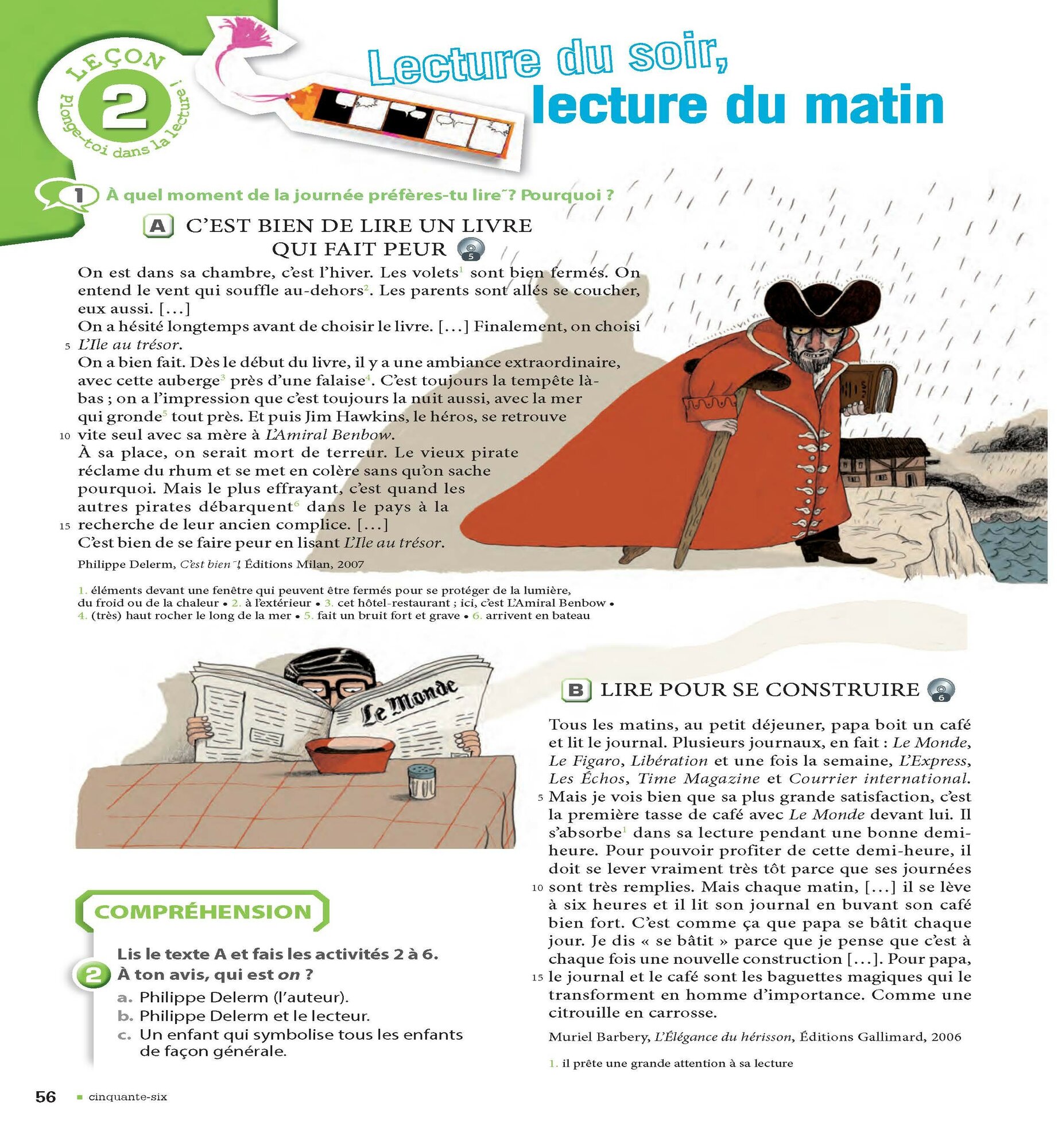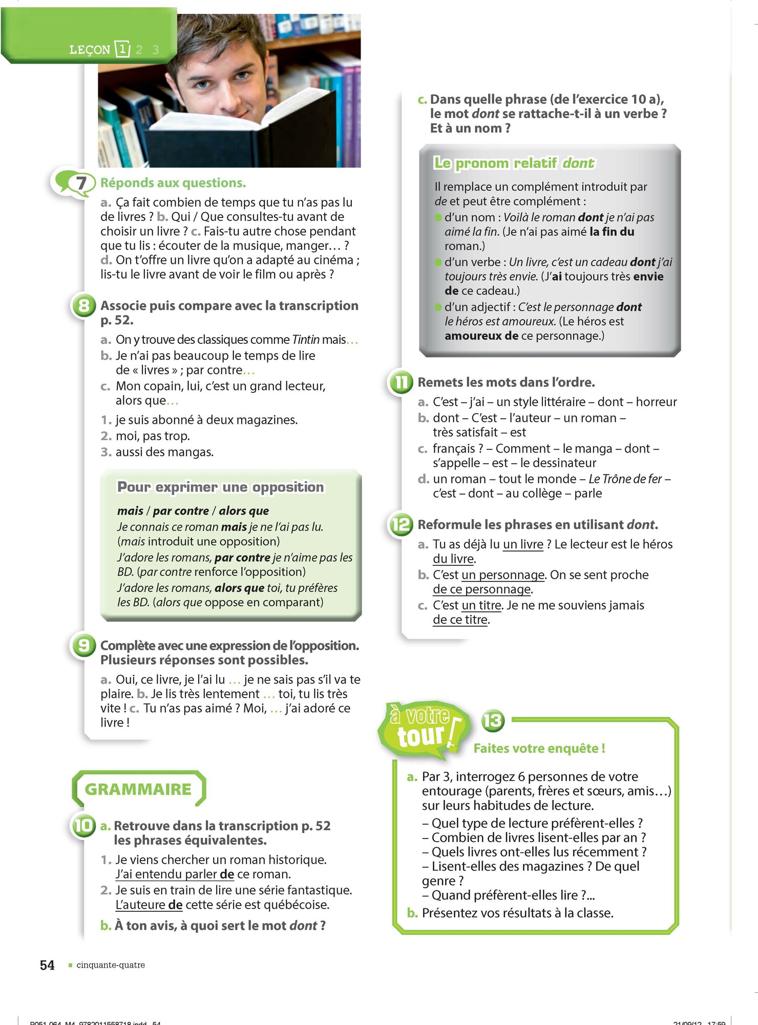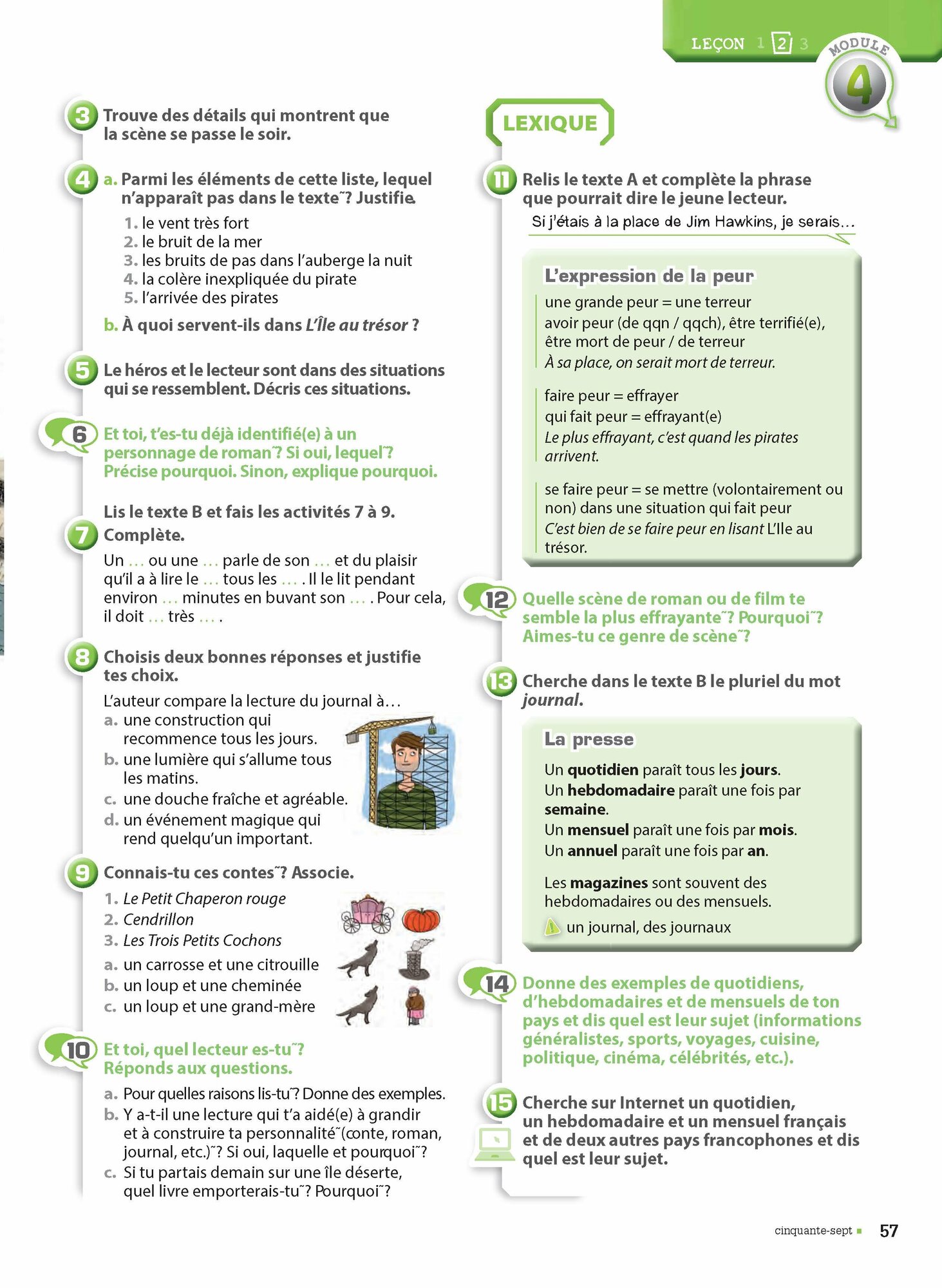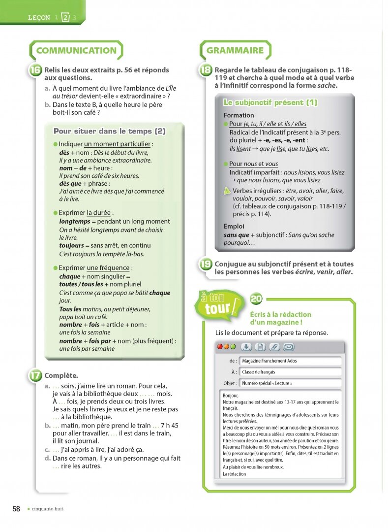 - la deuxieme lecon s'articule autour d'un extrait litteraire par un auteur francophone, plus une page " Entraine-toi "- la troisieme lecon est une lecon de prolongement : decouverte de la culture francophone
