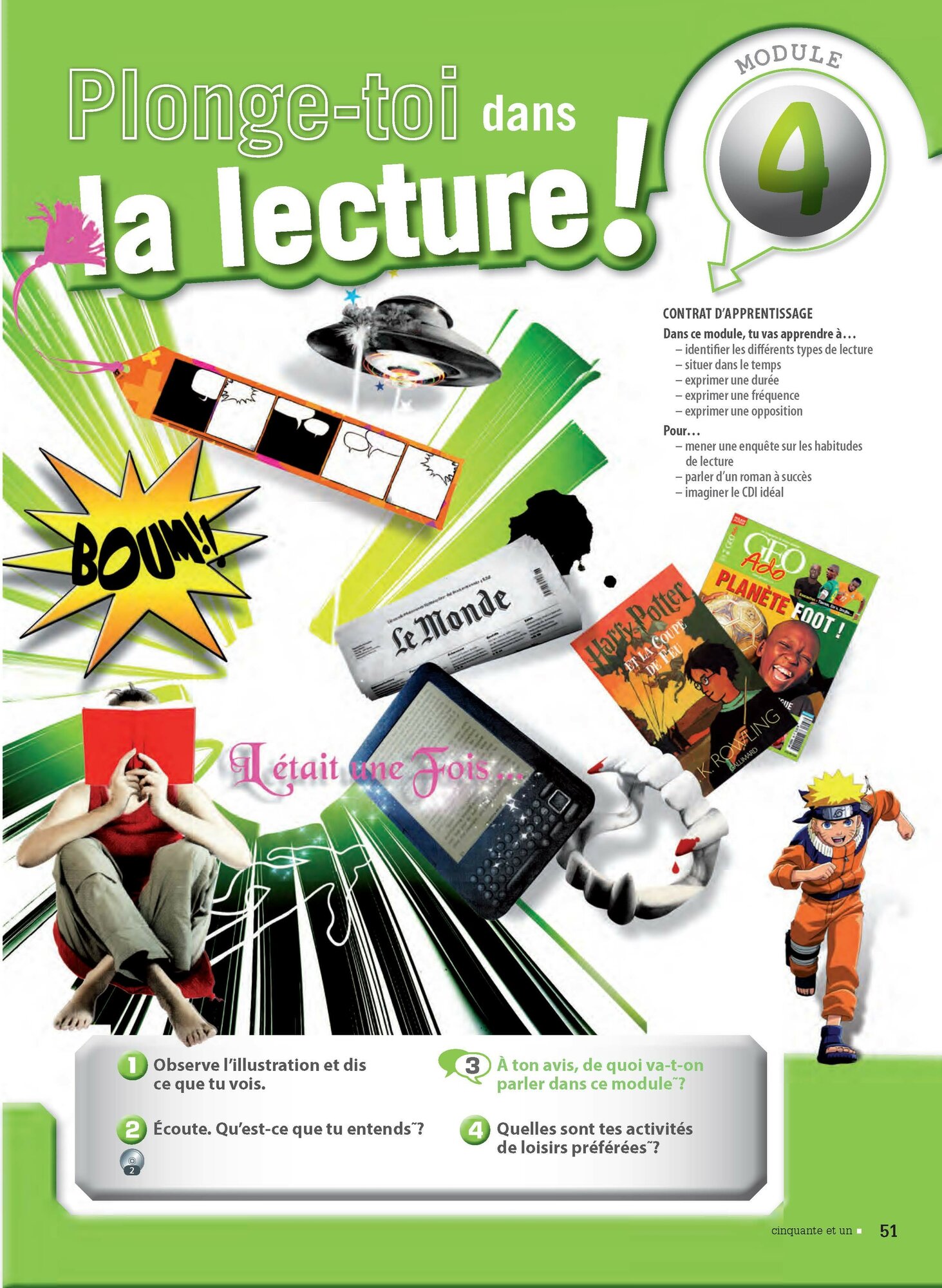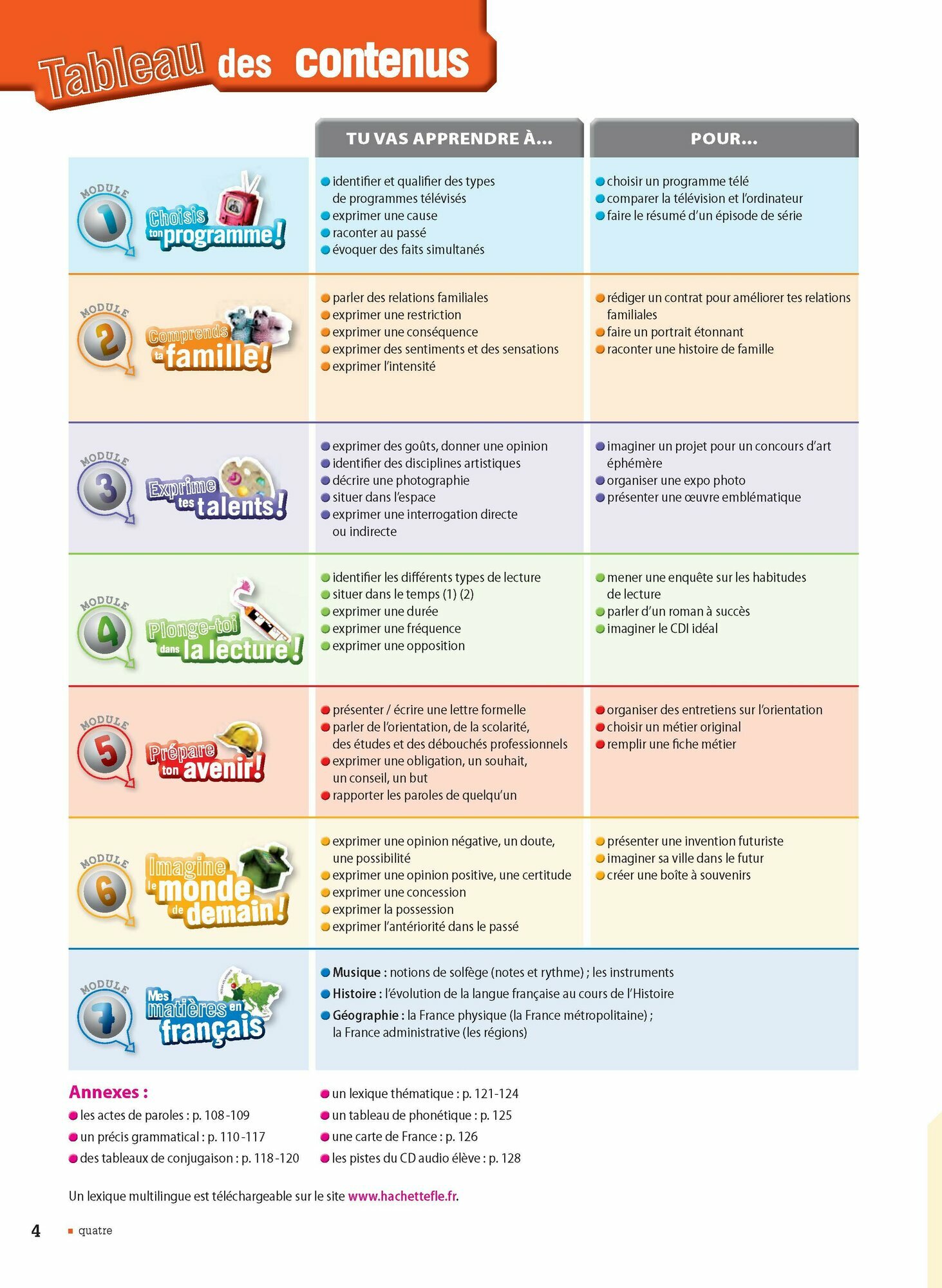 Entree thematique dans les modules: les spheres d'interet des ados sont explorees avec l'ouvertureculturelle sur le monde francais et francophone grace a de nombreux documents authentiques