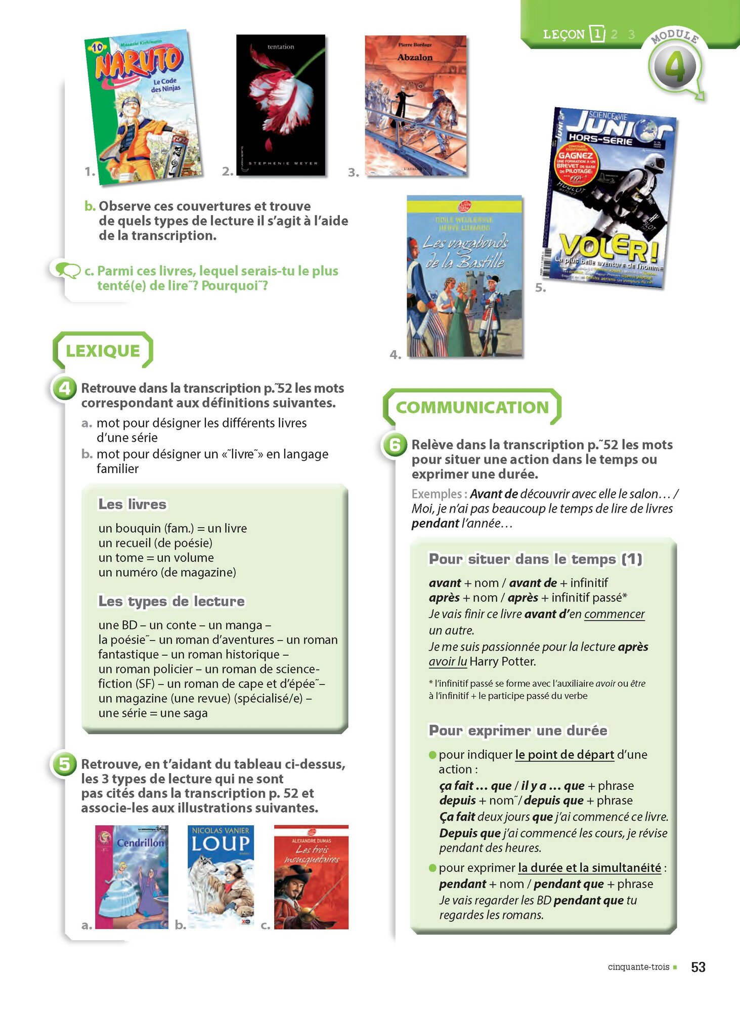 - la premiere lecon s'articule autour d'un document declencheur oral ou ecrit, plus une page "Entraine-toi"