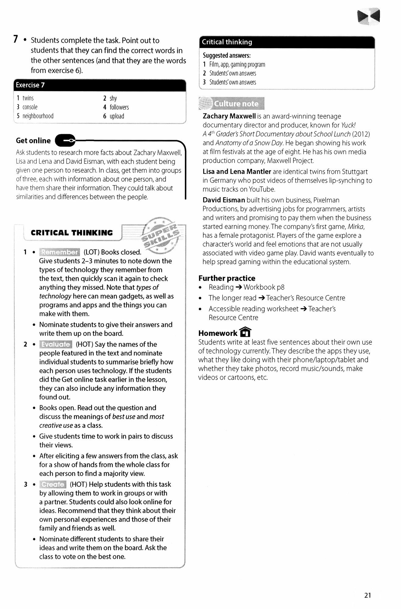 The Teacher's Book provides everything needed for efficient preparation and delivery of classes, whether teaching in person or remotely. The Teacher's App gives access to resources such as Teacher's eBook, Classroom Presentation Kit, audio and video, Test Generator and links to the Kahoot! quizzes.