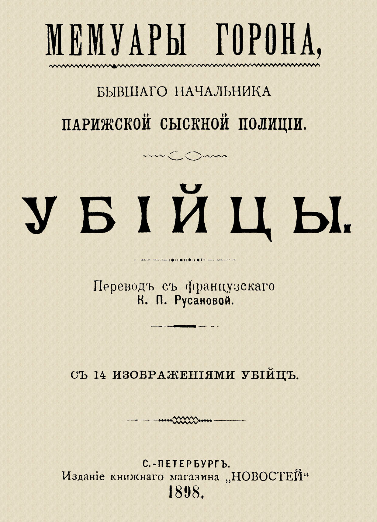 Мари-Франсуа Горон (1847-1933) начальник Парижской сыскной полиции с 1886 по 1895 гг. - автор детективных историй, основанных на реальных событиях. Он участвовал в войнах на Мартинике и в Алжире, а также в войне 1870 г., записавшись простым солдатом. В 1875 г. он был лейтенантом, а затем стал капитаном запаса. В 1881 г. поступил в префектуру полиции Парижа. В 1882 г. он стал секретарем полицейского участка района Сен-Венсан-де-Поль в Париже. Его карьера была тогда стремительной: в 1886 г. он был назначен начальником Главного управления полиции Парижа. После выхода на пенсию в 1895 г. он открыл частную полицейскую фирму и начал писать свои мемуары, а затем детективные романы. Призванный добровольцем в начале войны в 1914 г., он служил во Втором бюро Генерального штаба (военная разведка).