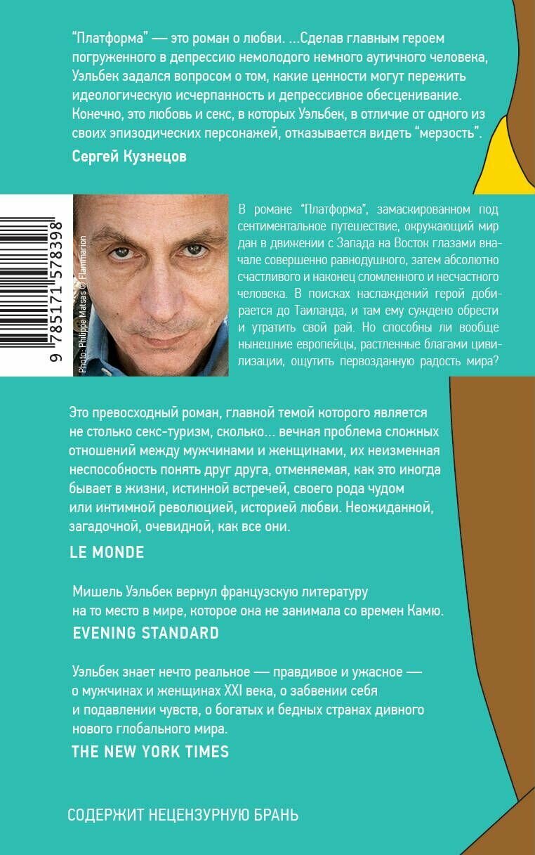 Отпуск в Таиланде оборачивается для Мишеля невероятным приключением. Устав от тусклой жизни в Европе, он охотно предается всем видам туристических услуг. Среди этой кутерьмы белым парусом выплывает прекрасная Валери. Она заставляет Мишеля буквально задыхаться от любви, восхищения и удовольствия. Вместе они открывают для себя истинные мотивы путешествия из Европы в Азию и строят на этом прибыльный бизнес. Увы, у этой истории не будет счастливого конца. «Я понял смерть; не думаю, что она причинит мне особые страдания» – скажет Мишель на последних страницах романа. «Уэльбек знает нечто реальное — правдивое и ужасное — о мужчинах и женщинах XXI века, о самозабвении и подавлении чувств…» (New York Times). Мишель Уэльбек – автор многих романов («Серотонин», «Уничтожить», «Элементарные частицы» и др.), сборников стихотворений и эссе. В 2019 году Эмманюэль Макрон вручил писателю наивысшую награду Франции – Орден Почетного Легиона. На Парижском кинофестивале 2002 года «Платформа» получила премию «Лучший кинороман» как лучшая книга для экранизации