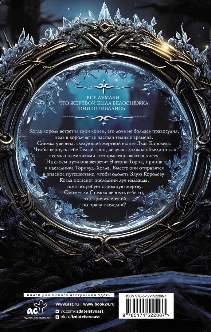 В мире, где правосудие стало тщетным и темные силы берут верх, Снежка решает вернуть себе престол. Вместе с семью наемниками и принцем Эштоном Торном, она отправится в опасное путешествие, чтобы победить Злую Королеву. Приготовьтесь к завораживающему роману, где пламенные страсти переплетаются с магией и волшебством.