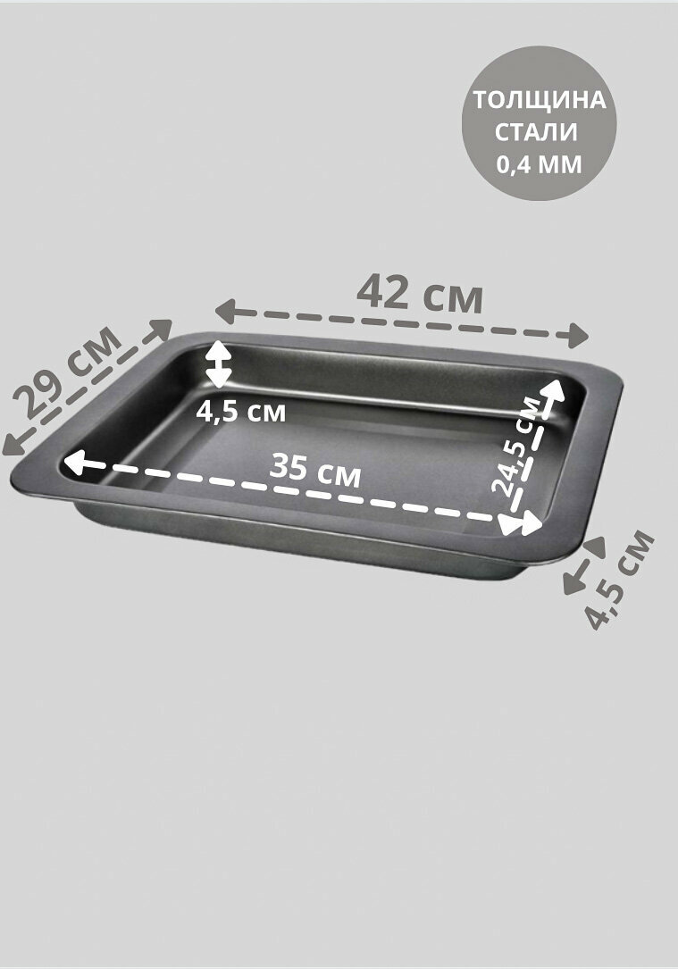 Противень Termico "Classico" изготовлен из высококачественной углеродистой стали с антипригарным покрытием, благодаря чему продукты не пригорают и не прилипают к стенкам посуды. Кроме того, готовить можно с добавлением минимального количества масла и жиров. Антипригарное покрытие также обеспечивает легкость мытья. Стальные стенки посуды быстро распределяют тепло, благодаря чему продукты запекаются равномерно. Для чистки нельзя использовать абразивные чистящие средства и жесткие губки. . Высота стенки формы: 4,5 см. Толщина дна: 0,4 мм. Максимальная температура нагрева не выше 250 °C. Внутренний размер противня: 36,5х26х4,1 см. Обратите внимание: Размер формы по верхнему краю: 42х 29 х 4,5 см.