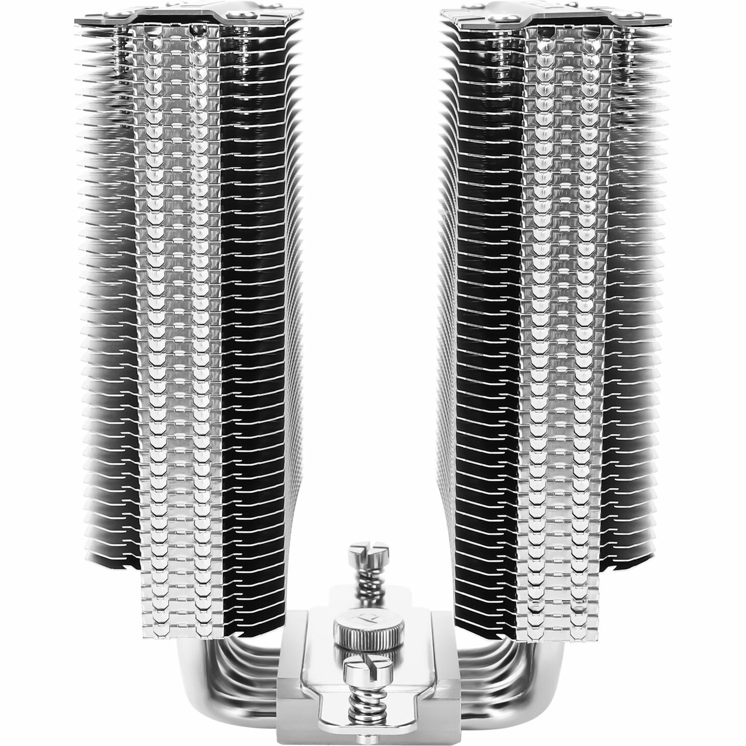 Новинка имеет компоновку башенного типа с двухсекционным радиатором. Равновеликие секции, в каждой из которых насчитывается по 45 алюминиевых ребер, расположены параллельно и соединены одна с другой посредством шести U-образных медных никелированных тепловых трубок диаметром 6 мм. Трубки проходят через медную никелированную пластину-основание с отполированной до зеркального блеска подошвой.