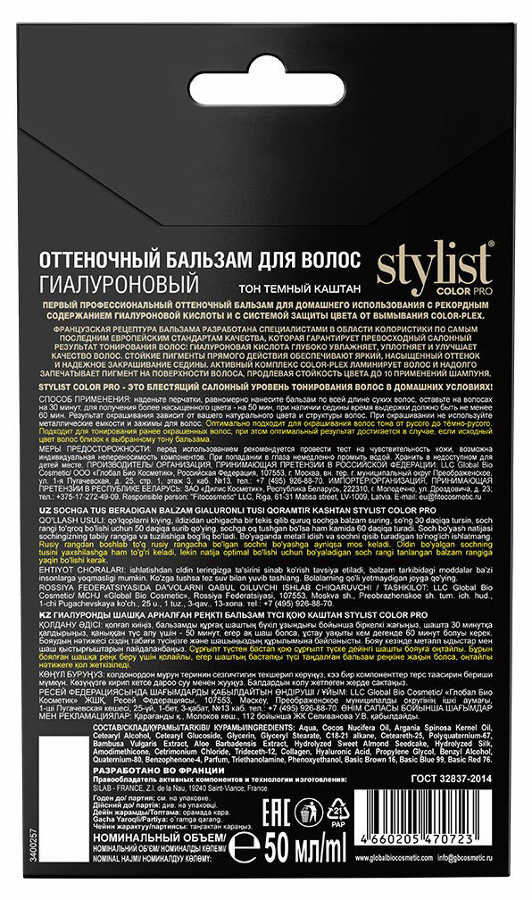 Первый профессиональный оттеночный бальзам для домашнего использования с рекордным содержанием гиалуроновой кислоты и с системой защиты цвета от вымывания Color-plex. Французская рецептура бальзама разработана специалистами в области колористки по самым последним европейским стандартам качества, которая гарантирует превосходный салонный результат тонирования волос! Гиалуроновая кислота глубоко увлажняет, уплотняет и улучшает качество волос. Стойкие пигменты прямого действия обеспечивают яркий, насыщенный оттенок и надежное закрашивание седины. Активный комплекс Color-plex ламинирует волос и надолго запечатывает пигмент на поверхности волоса, продлевая стойкость цвета до 10 применений шампуня. STYLIST COLOR PRO- это блестящий салонный уровень тонирования волос в домашних условиях!