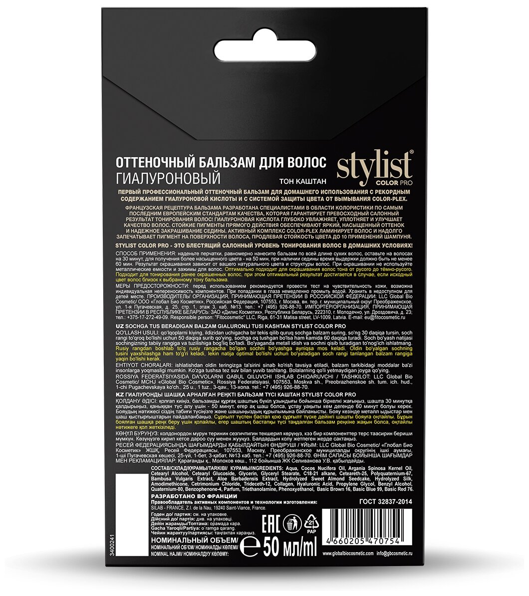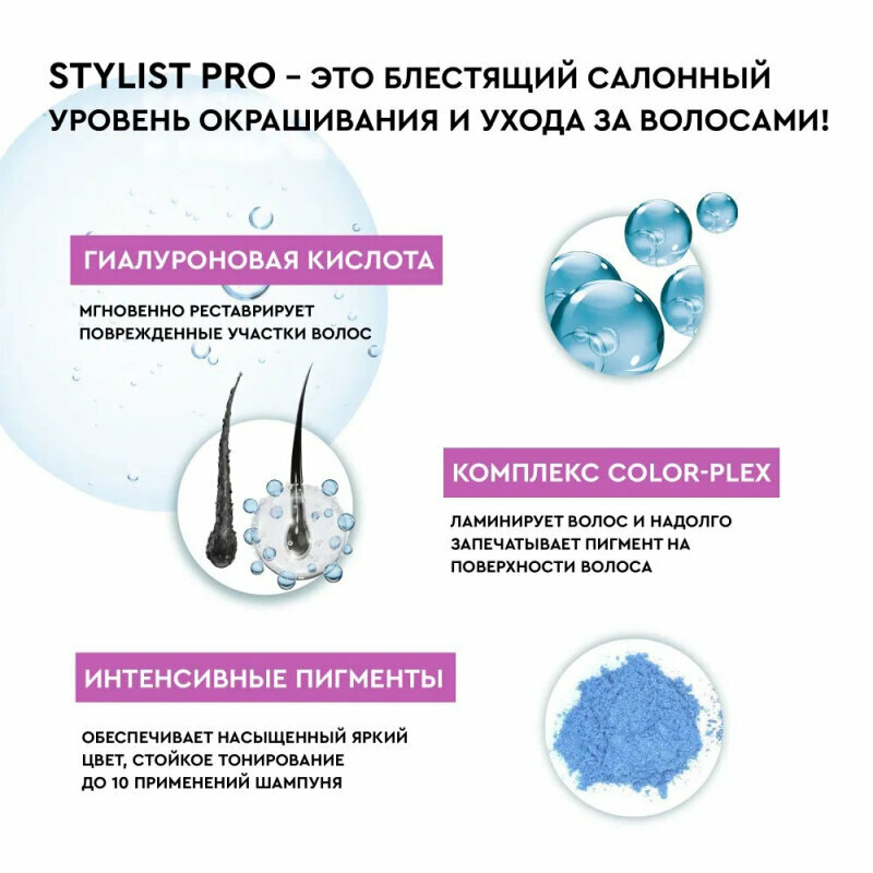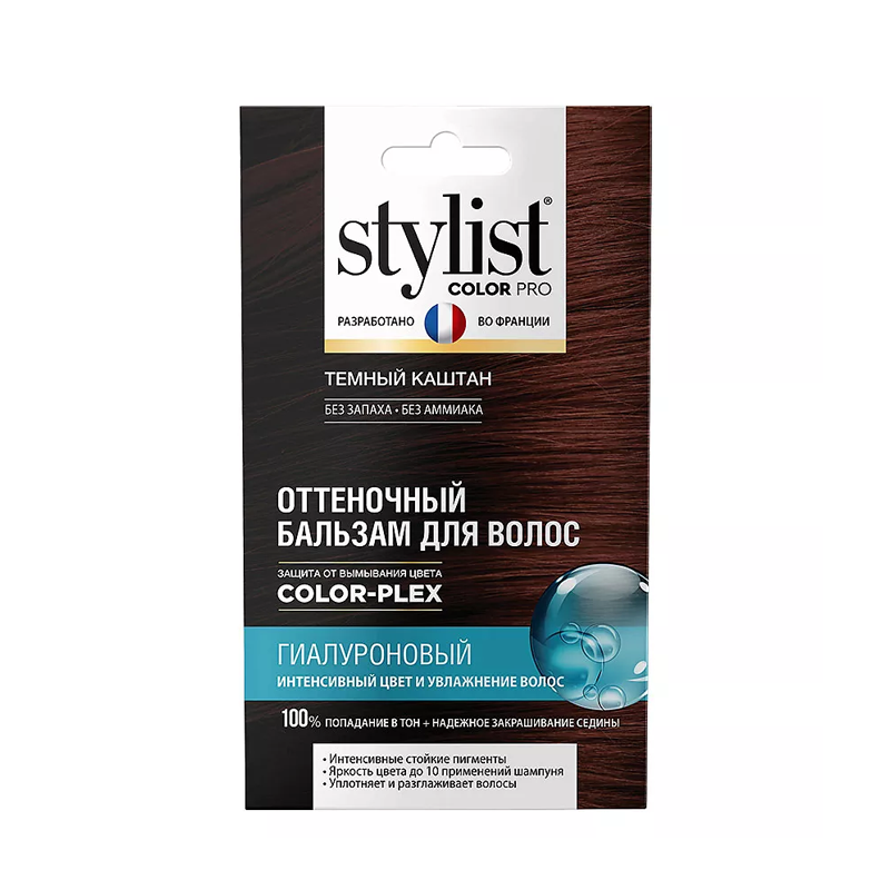 Первый профессиональный оттеночный бальзам для домашнего использования с рекордным содержанием гиалуроновой кислоты и с системой защиты цвета от вымывания Color-plex. Французская рецептура бальзама разработана специалистами в области колористки по самым последним европейским стандартам качества, которая гарантирует превосходный салонный результат тонирования волос! Гиалуроновая кислота глубоко увлажняет, уплотняет и улучшает качество волос. Стойкие пигменты прямого действия обеспечивают яркий, насыщенный оттенок и надежное закрашивание седины. Активный комплекс Color-plex ламинирует волос и надолго запечатывает пигмент на поверхности волоса, продлевая стойкость цвета до 10 применений шампуня. STYLIST COLOR PRO- это блестящий салонный уровень тонирования волос в домашних условиях!