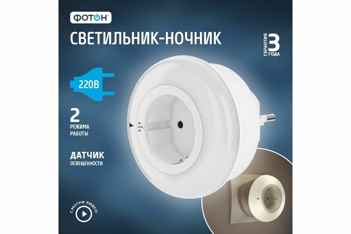 Производство: ''Фотон'' (Китай). Вес брутто: 0,19 кг. Используется как дополнительное декоративное освещение в спальнях, детских комнатах, коридорах, кухнях и других жилых помещениях. Ночник изготавливается из прочного безопасного пластика. Основные преимущества: светодиоды в качестве источников света, не нагреваются. Мягкое свечение. Компактный размер. Стильный современный дизайн. Низкое потребление энергии. Оснащен датчиком света.