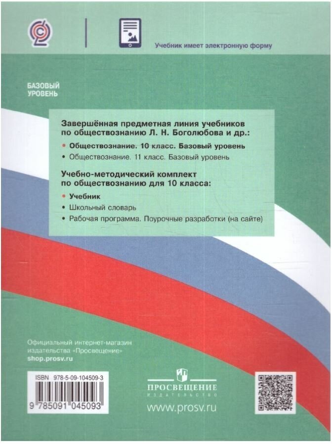 Учебник создан в соответствии с требованиями Федерального государственного образовательного стандарта среднего общего образования. Он является центральным компонентом учебно-методического комплекта по обществознанию для 10 класса. Работа с учебником обеспечит сформированность у школьников знаний об обществе как целостной развивающейся системе в единстве и взаимодействии его основных сфер и институтов, представлений о современном российском обществе, об основных тенденциях развития мирового сообщества в глобальном мире. Методический аппарат ориентирован на активную работу с различными источниками социальной информации и проектную деятельность.