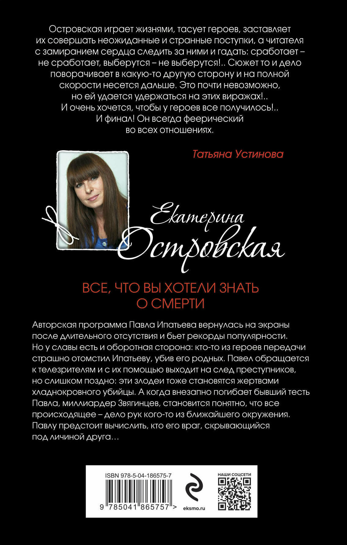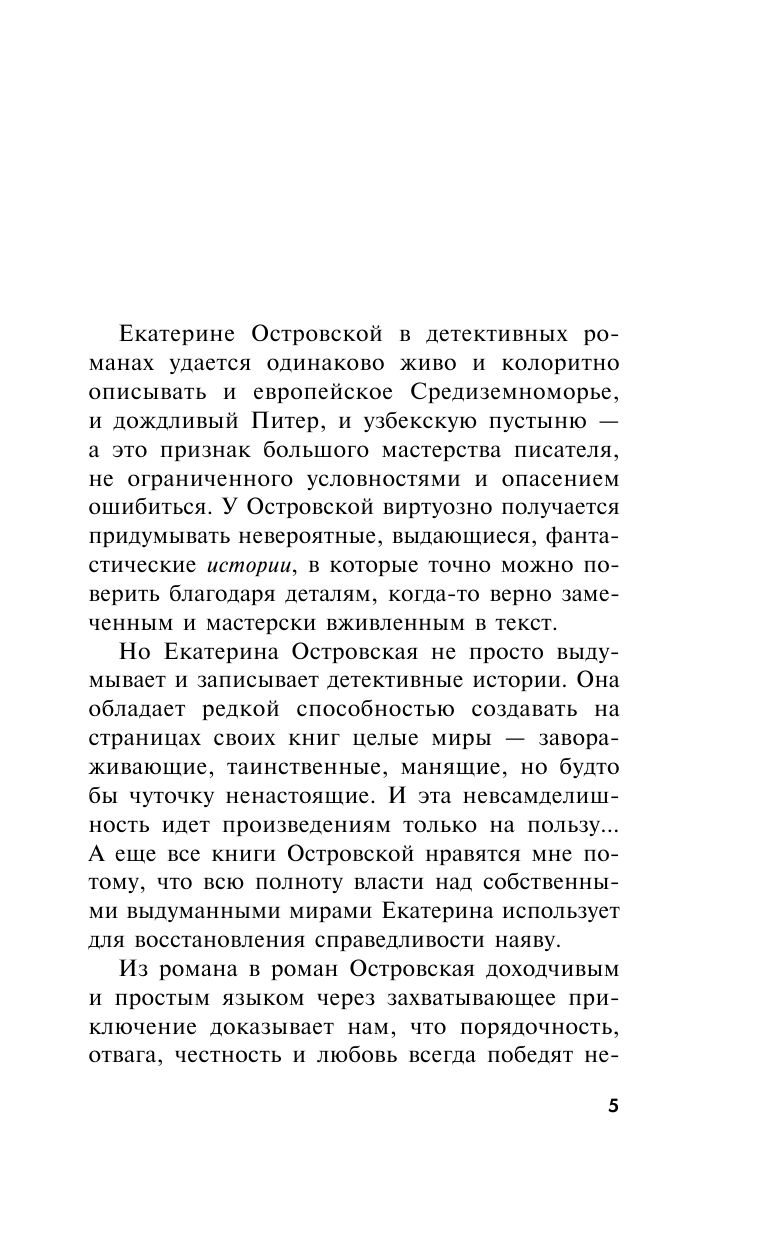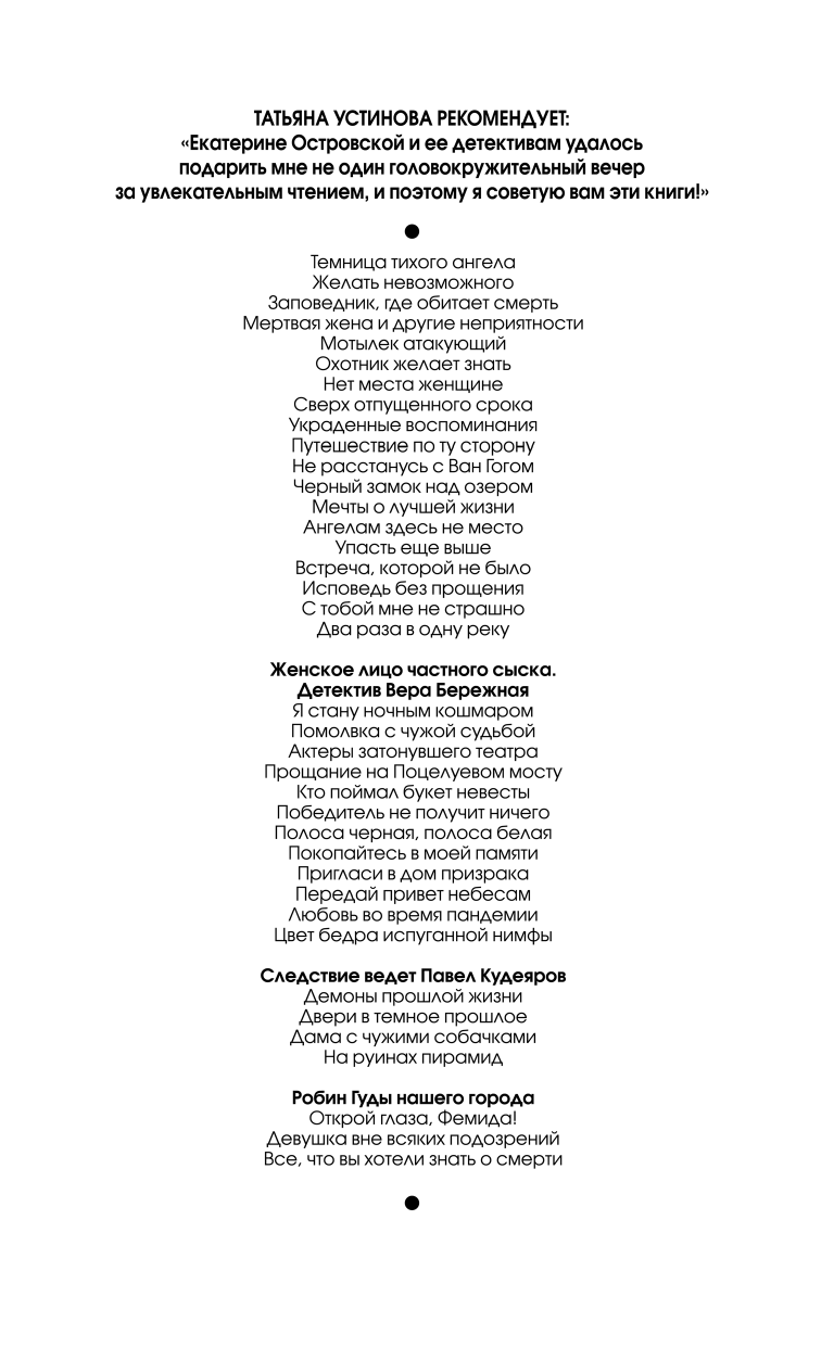 Татьяна Устинова рекомендует: "Екатерина Островская не просто выдумывает и записывает детективные истории. Она обладает редкой способностью создавать на страницах своих книг целые миры - завораживающие, таинственные, манящие, но будто бы чуточку ненастоящие. И эта невсамделишность идет произведениям только на пользу… А еще все книги Островской нравятся мне потому, что всю полноту власти над собственными выдуманными мирами Екатерина использует для восстановления справедливости наяву".
